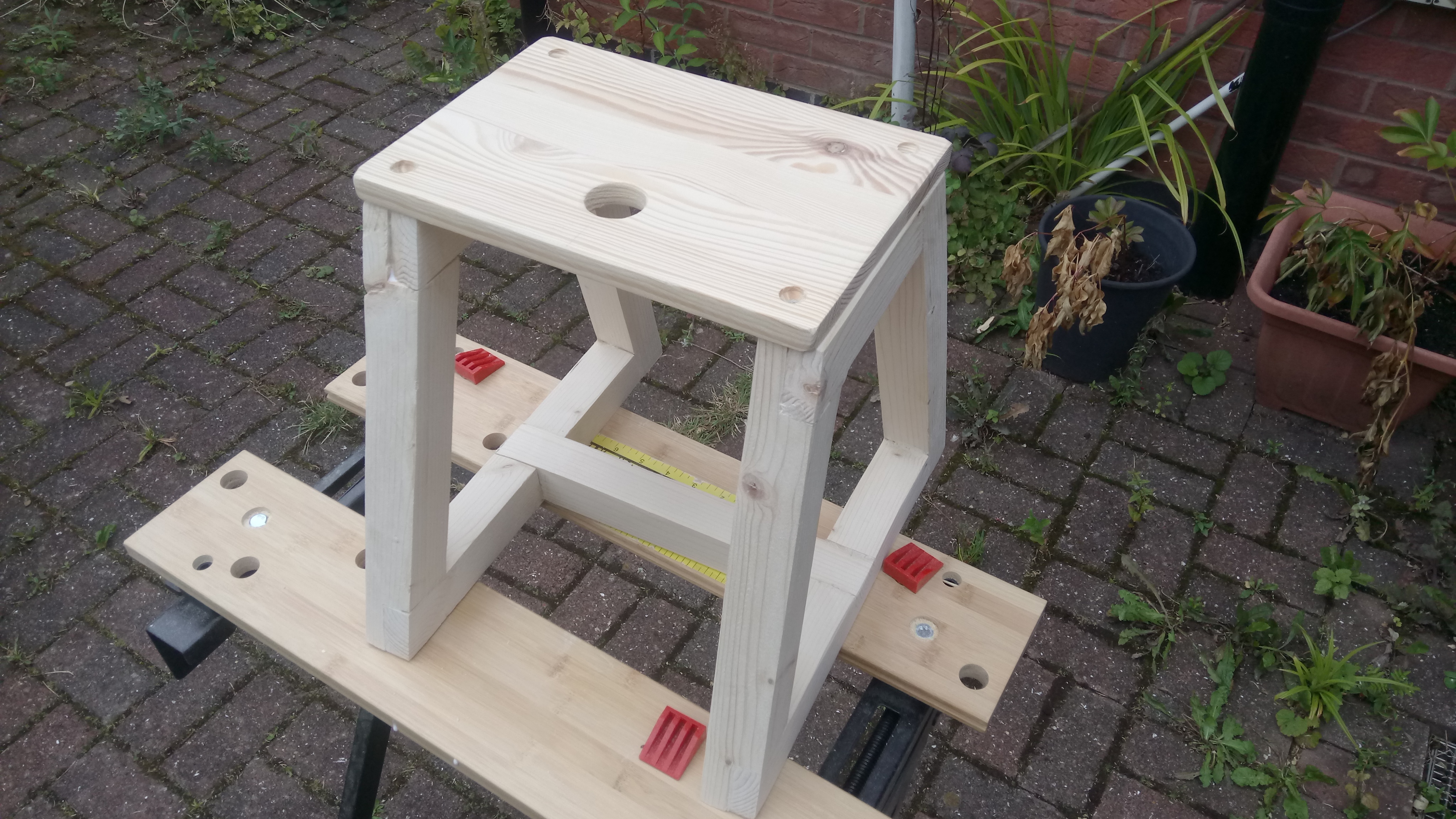 The stool itself is constructed from a single 2 x 4 (mine was a standard B&Q pine), which is ripped and crosscut (divided) into the various lengths required. At this point of my hobbying, I only have hand tools to work with, so some of the angled cuts were a bit tricky! I may have to try making this again in a few years when I have acquired some new tools! But I think I did a pretty good job – I did alter the top section of the stool and placed a single piece of scrap wood across the top (which I acquired free along with a load more!) to be the top surface, rather than several pieces combined. But that is part of the fun of woodworking – it’s highly personal, there is no real right answer as there’s always multiple ways of doing things, and there is a defined outcome – I now have a nice new stool in the living room!