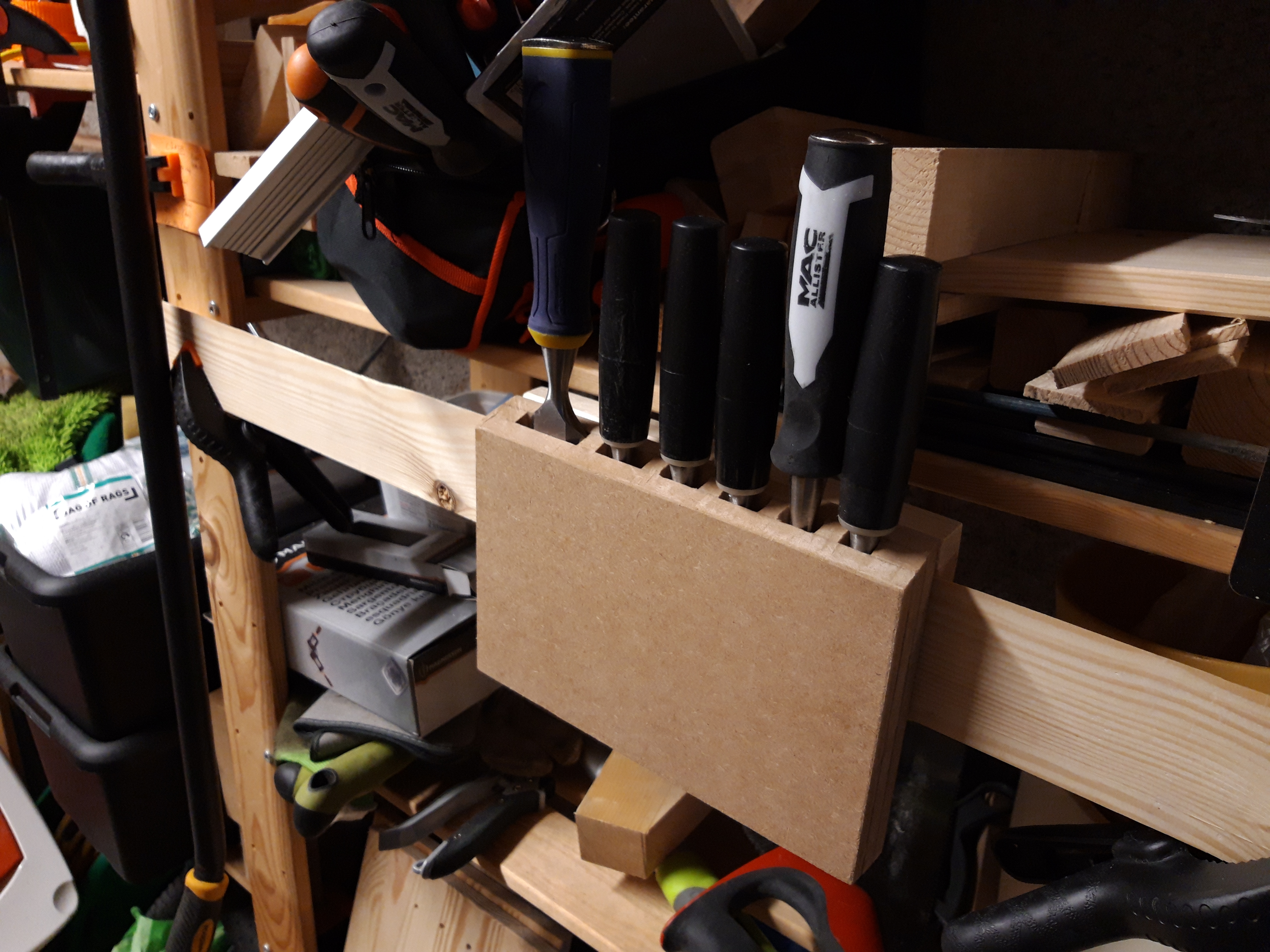 For anyone not familiar with the French Cleat system, it involves two pieces of wood cut at opposing 45 degree angles, each one secured onto the two different items to be connected. The angles then act as a holder and work really well to keep things in place, but still allow the items to be removed if required. They are used a lot in workshops I have seen belonging to other people and as I am still working out the best use of my space, and will potentially be moving house soon, having everything being movable is very helpful! So in this case, while the glue was drying on the mdf holder, I ripped a piece of pine with a 45 degree angle to attach to the shelving in the garage. Currently it is still clamped to the shelving, but I may screw it on at some point. As it is not having to take a lot of weight currently, the clamps seem to be doing a good job of keeping the beam in place. And if I end up with more space at the new house (whenever that happens) I may look to create several similar beams and screw them onto the wall for a larger amount of storage space. To finish I cut an angle into the top of the holder to allow for the ease of removal and replacing of the chisels and then simply glued the opposing 45 degree piece of pine onto the back of the mdf holder and clamped it until it dried. Once dry I placed the chisels inside and it sits nice and securely on the beam, allowing me to quickly grab whatever size chisel I need, or if I need several, I can remove the whole holder and take it with me to my workbench.