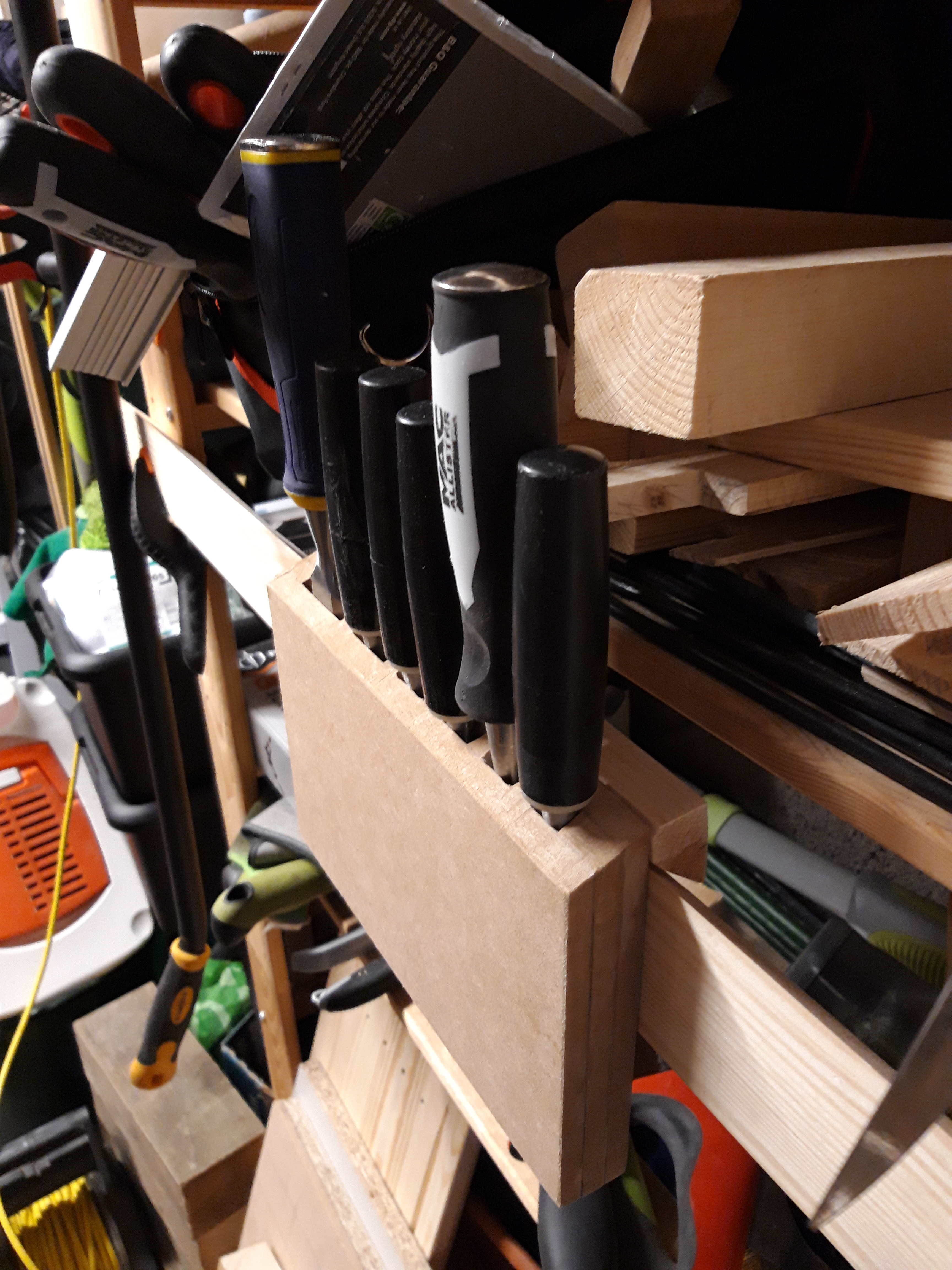 So the chisels are arranged on the mdf backing plate, with strips of mdf running in between as dividers. After making sure that the chisels actually fit in correctly and a little bit of adjusting, I glued on the front plate, clamped it down and waited for it all to dry.