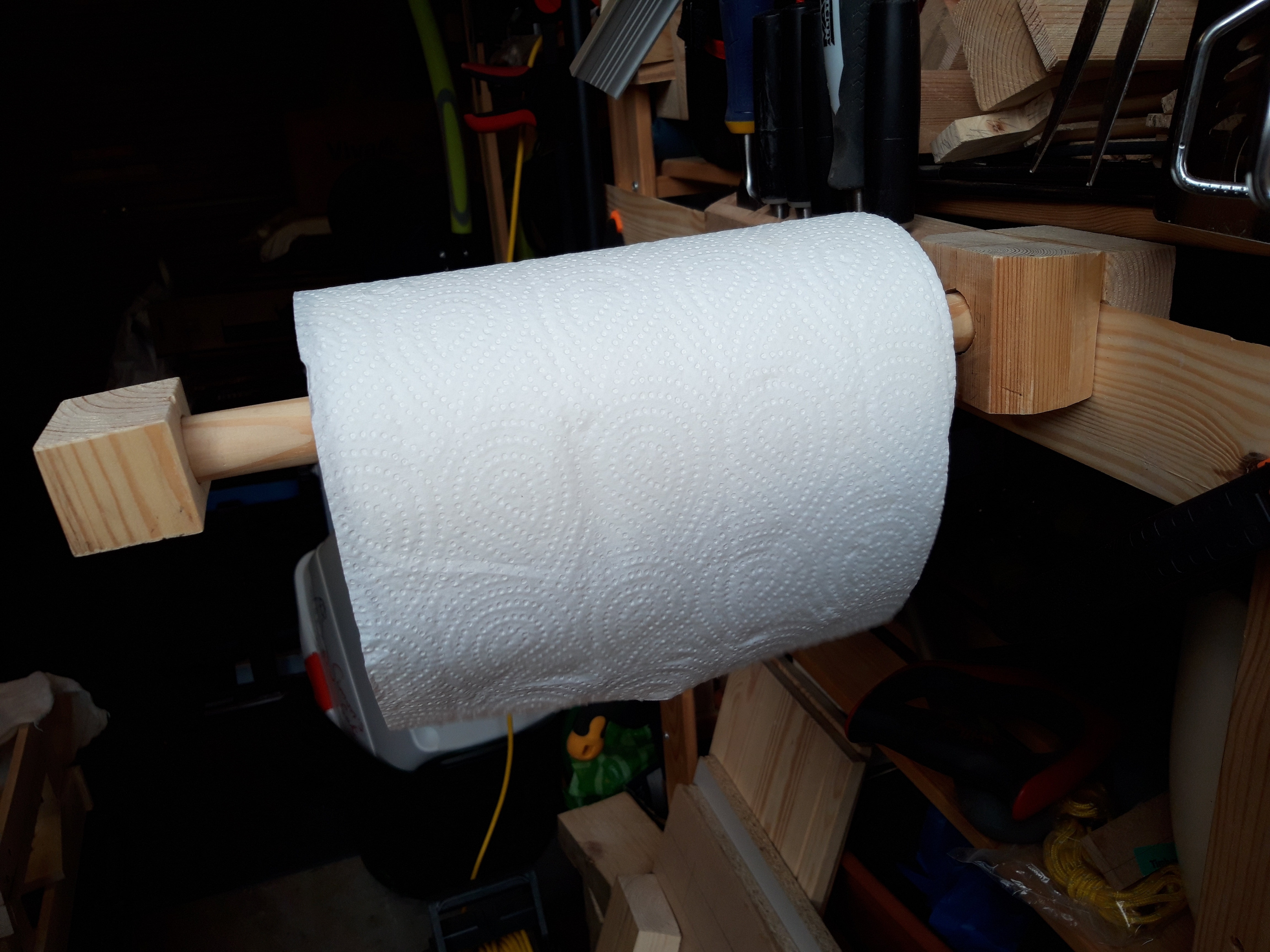 While creating projects involving glue, which is pretty much everything really, I always end up with a nice quantity of “glue squeeze-out” as I clamp things. And I get it all over my hands too. So I decided to create a blue roll/kitchen roll holder to put in the garage to make it easier for me to clean up after myself. I am generally pretty good at making a mess, so anything is worth a try I think!