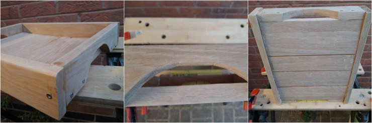 The handles were cut by hand (with some difficulty due to the hardness of the wood!) and once they were secured to the tray, the sides were then screwed and glued onto the base and handles. The tray was then left to dry for a nice long period of time – one of the few benefits of doing my woodworking outside, is that I am frequently affected by the terrible British weather (which is bad), but means that things currently being glued and clamped often have to sit for several days before I can carry out the next step!