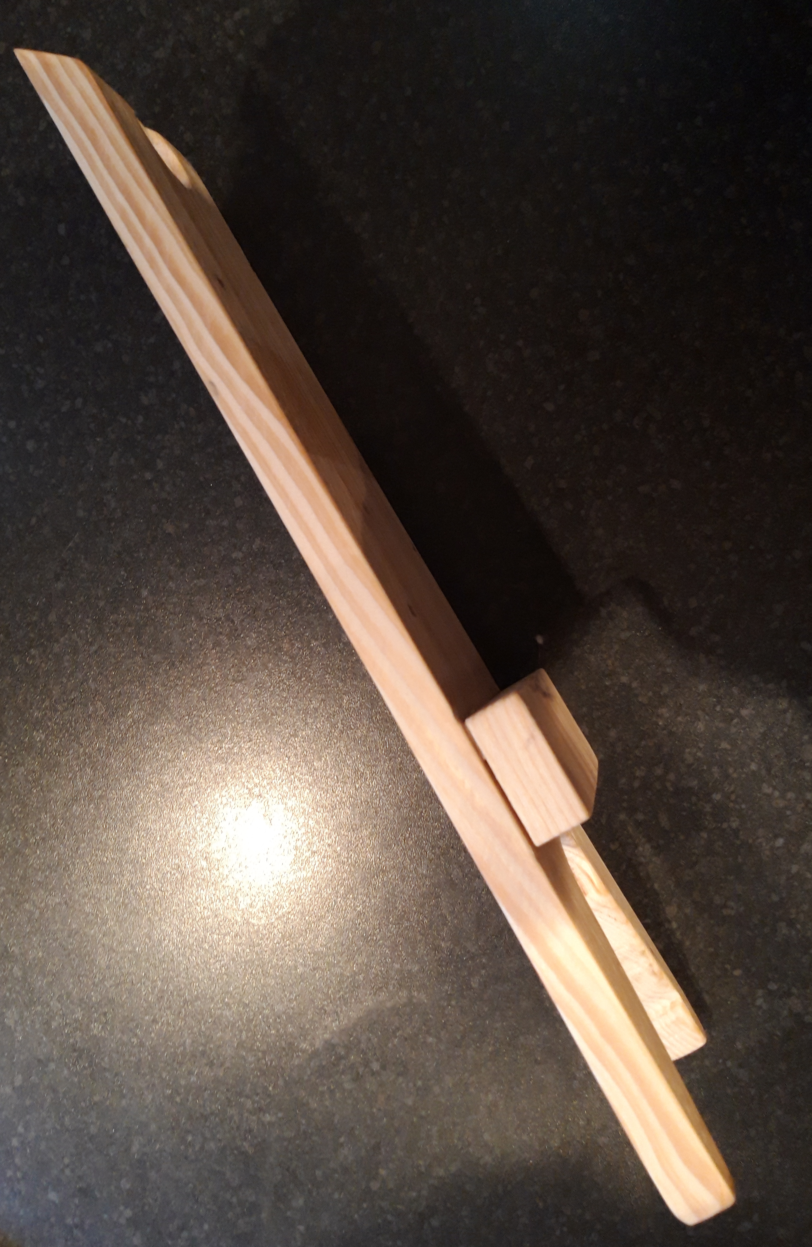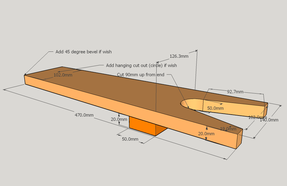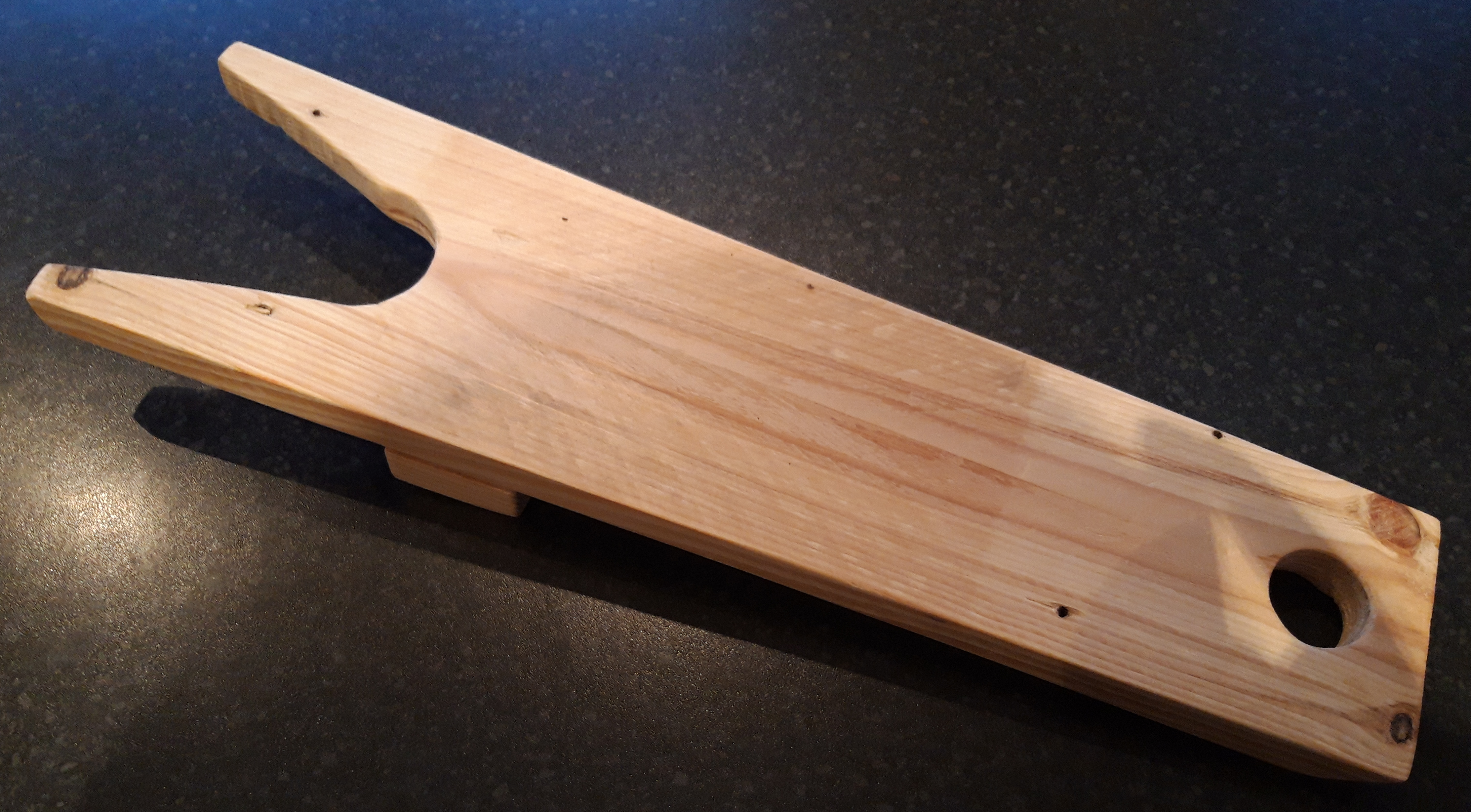 So once the dimensions were determined I found a suitable piece of wood and set to work. The whole thing only took me about an hour to make, as it was a relatively simple construction. The only tricky bit was the tapering from the front end to the back, to make sure that it was even on both sides. I used a circular drill bit to cut out the prongs and the hole at the back end for hanging it up. I then used a saw to cut from the front back to the hole I’d just drilled to form the prongs, as well as to cut an additional piece to go underneath to raise the prongs up.
