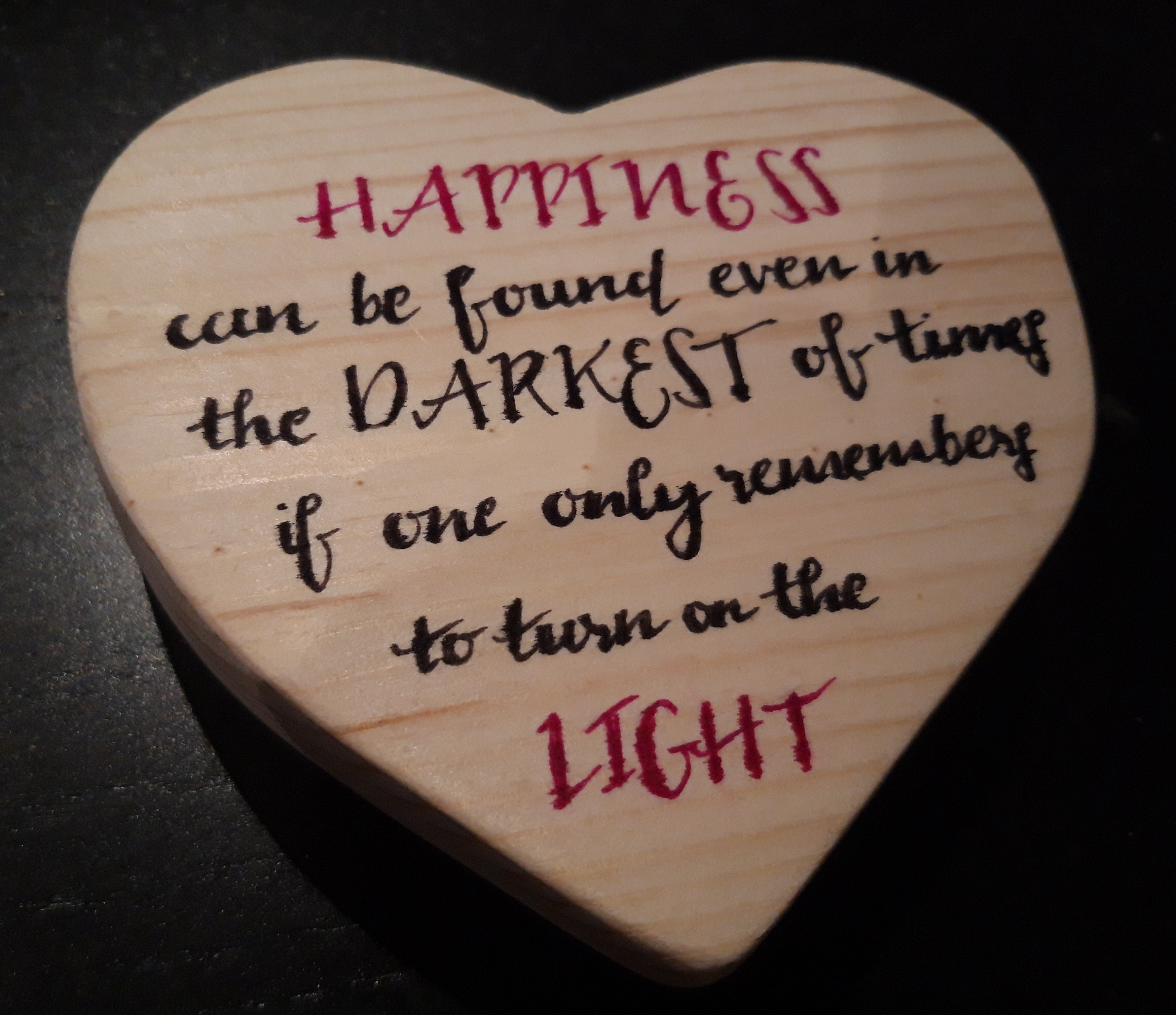 My wife Jenny has fantastic handwriting and wrote a quote said by Dumbledore in Harry Potter on the back – “Happiness can be found even in the darkest of times if one only remembers to turn on the light”.