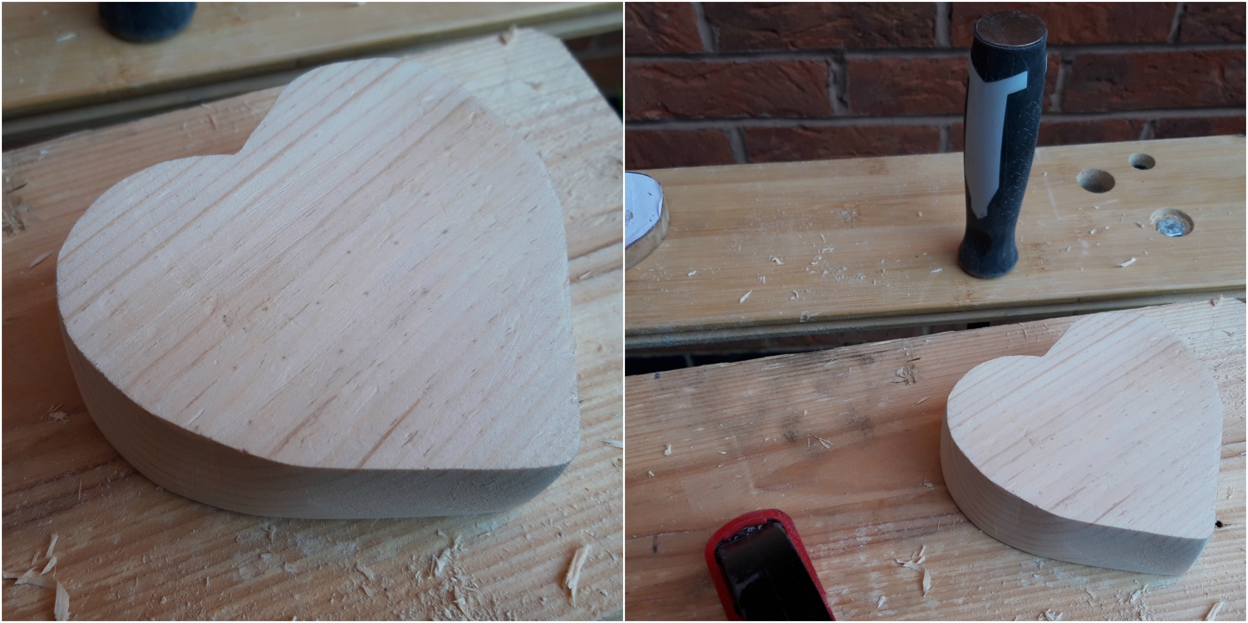 I then used a saw drill bit and a spade drill bit to cut a hole into the centre of the heart for the tea light. Then I did a whole lot more sanding to smooth the edges of the heart and the inside of the tea light hole.