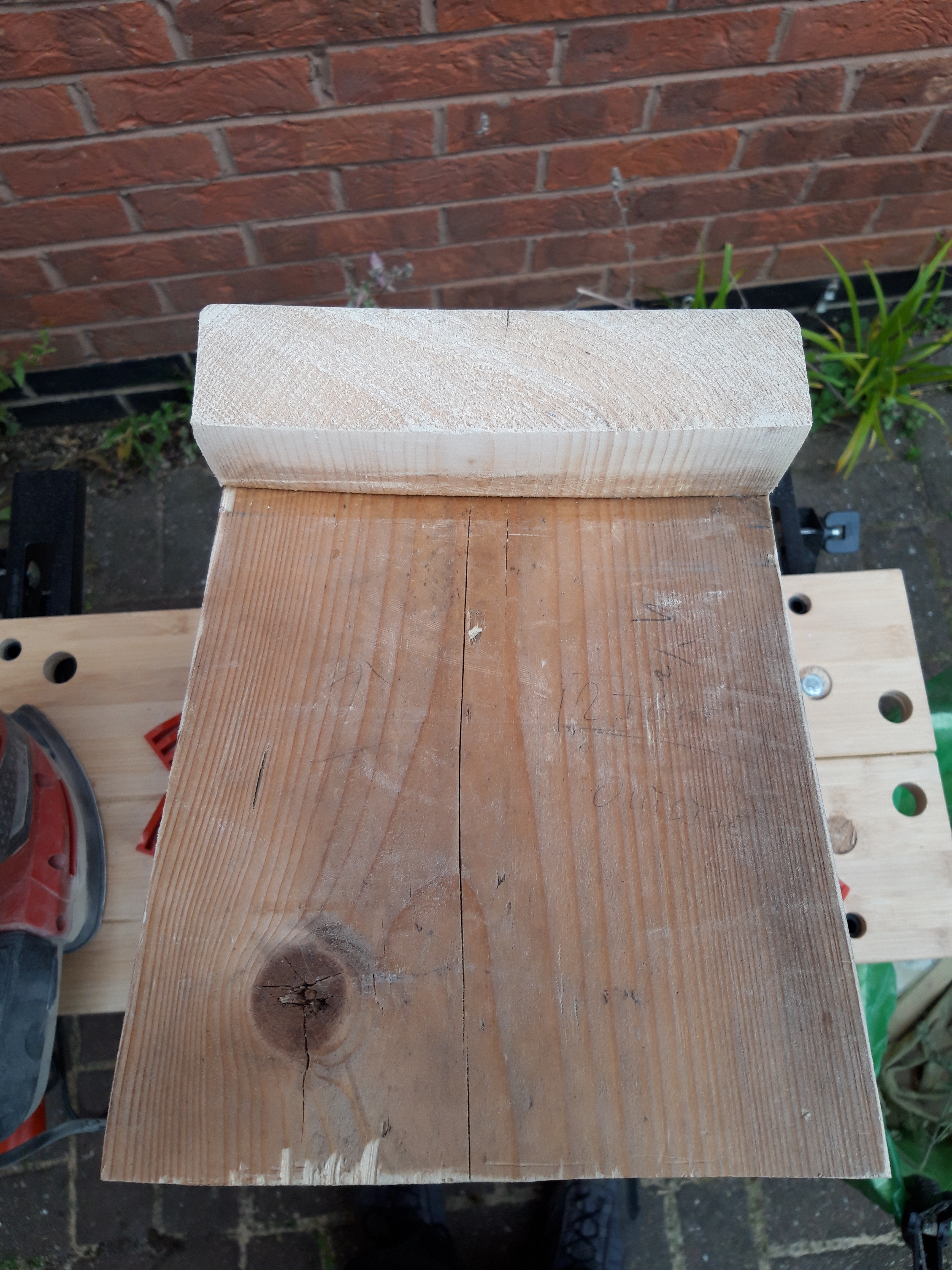 I glued the centre brace into the middle section between the legs and then turned the stool the right way up and left it for a couple of days to fully dry. Then it was a large amount of sanding again, working my way through the grits, to smooth all the surfaces of the stool and make it comfortable for sitting on. This took a little while, but as the board was reclaimed scrap, it was really quite grubby and was considerably darker on the sides which had been exposed to the elements. By thoroughly sanding the wood on all sides I uncovered the much paler wood underneath.