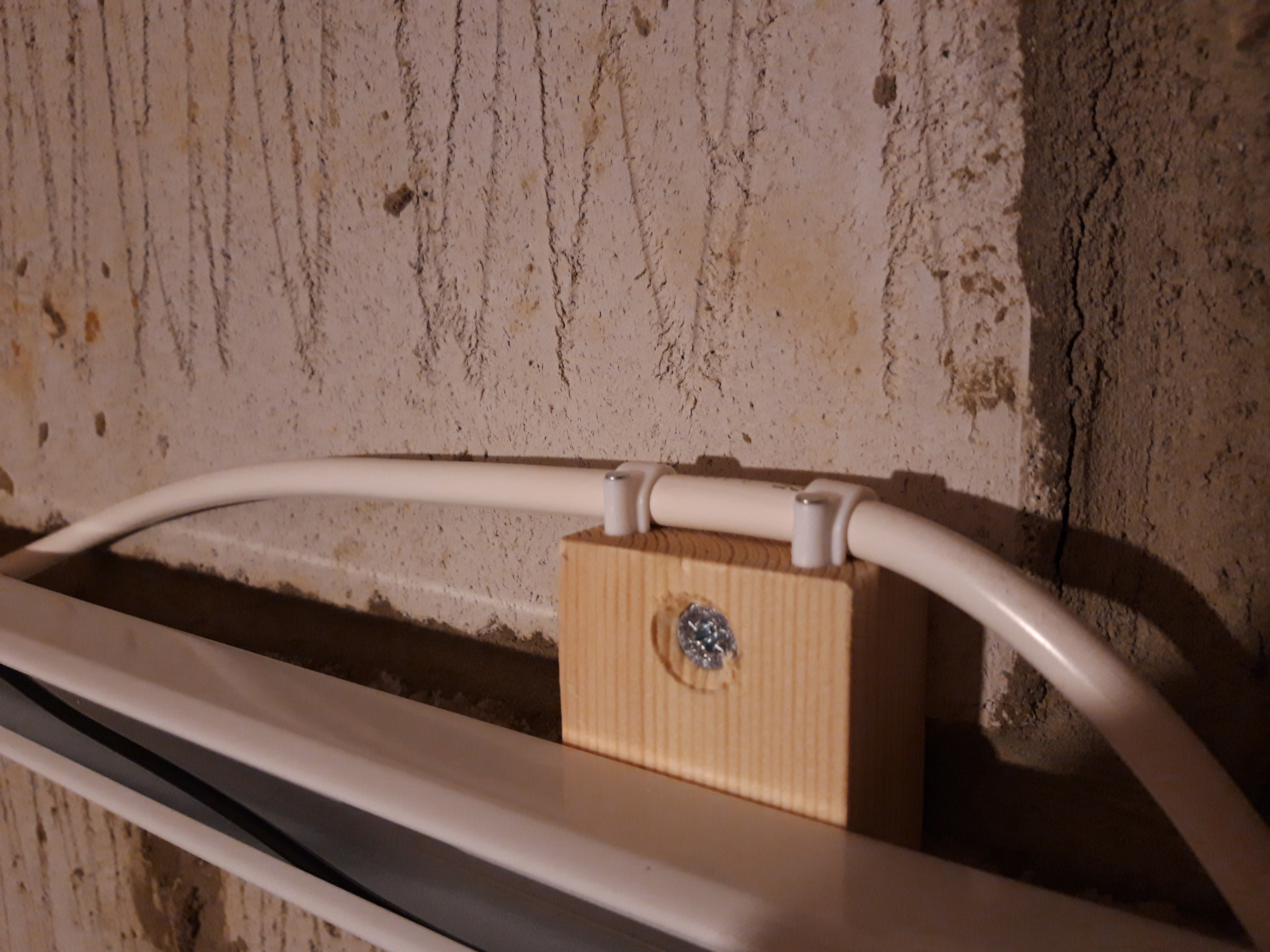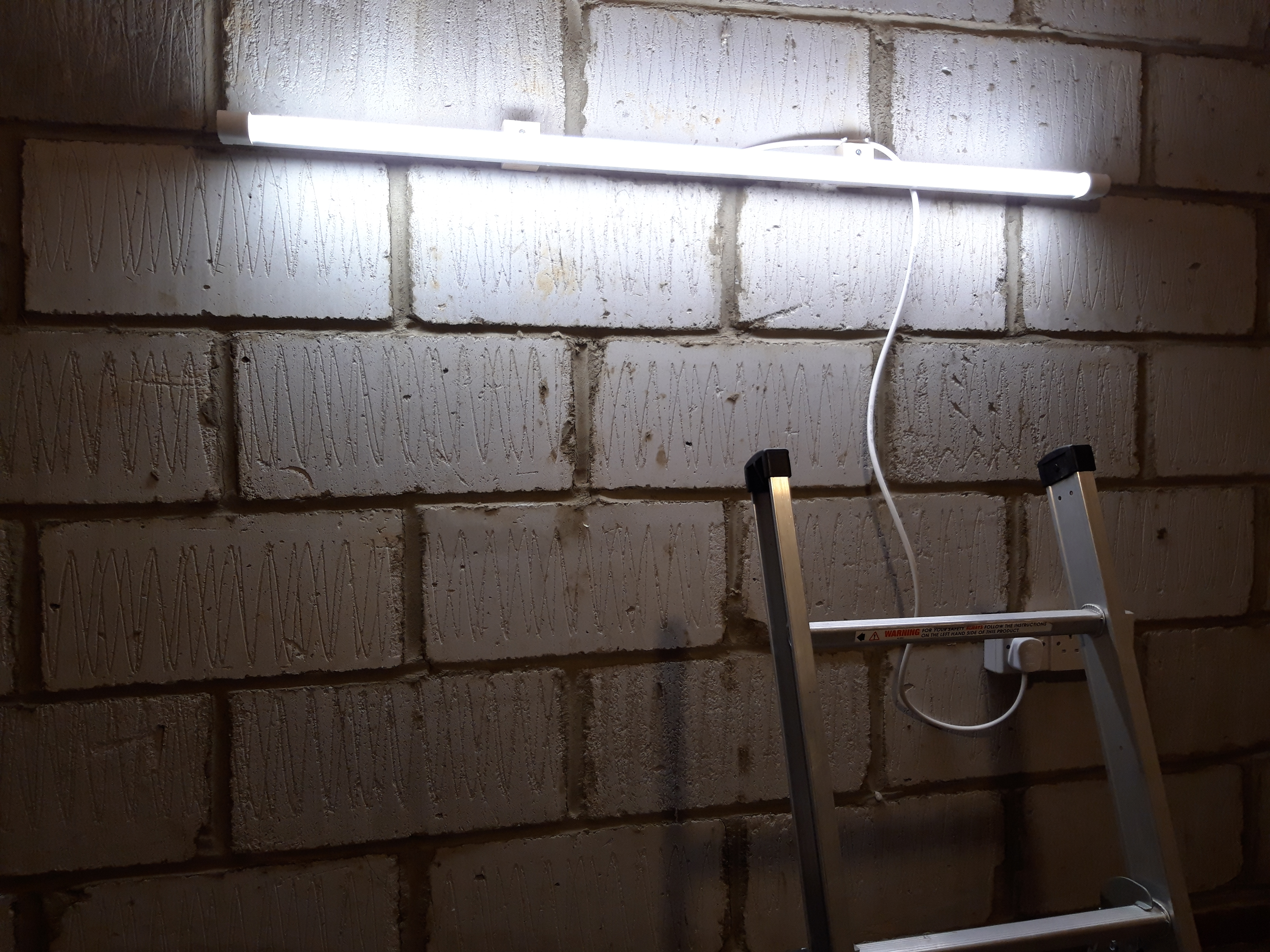 After lots of research, I settled on a fluorescent light tube, which I mounted to the wall in existing rawl plugged holes using wooden blocks. The light tube is designed to be mounted to the ceiling, so the wire comes out of the top side. However I live in a rented property and cannot make lots of holes in the ceiling to wire in a whole new lighting setup without the landlord’s permission! Plus that seemed a lot more of a drastic solution. So after doing lots of reading I settled on a wall-mounted light and plugged into a standard socket. I made sure to have sufficiently high tolerance wiring and the right amperage fuse for the plug too. And with the blocks then secured to the wall, I could mount the light fitting to the blocks, which gave enough clearance underneath for the wiring to fit.
