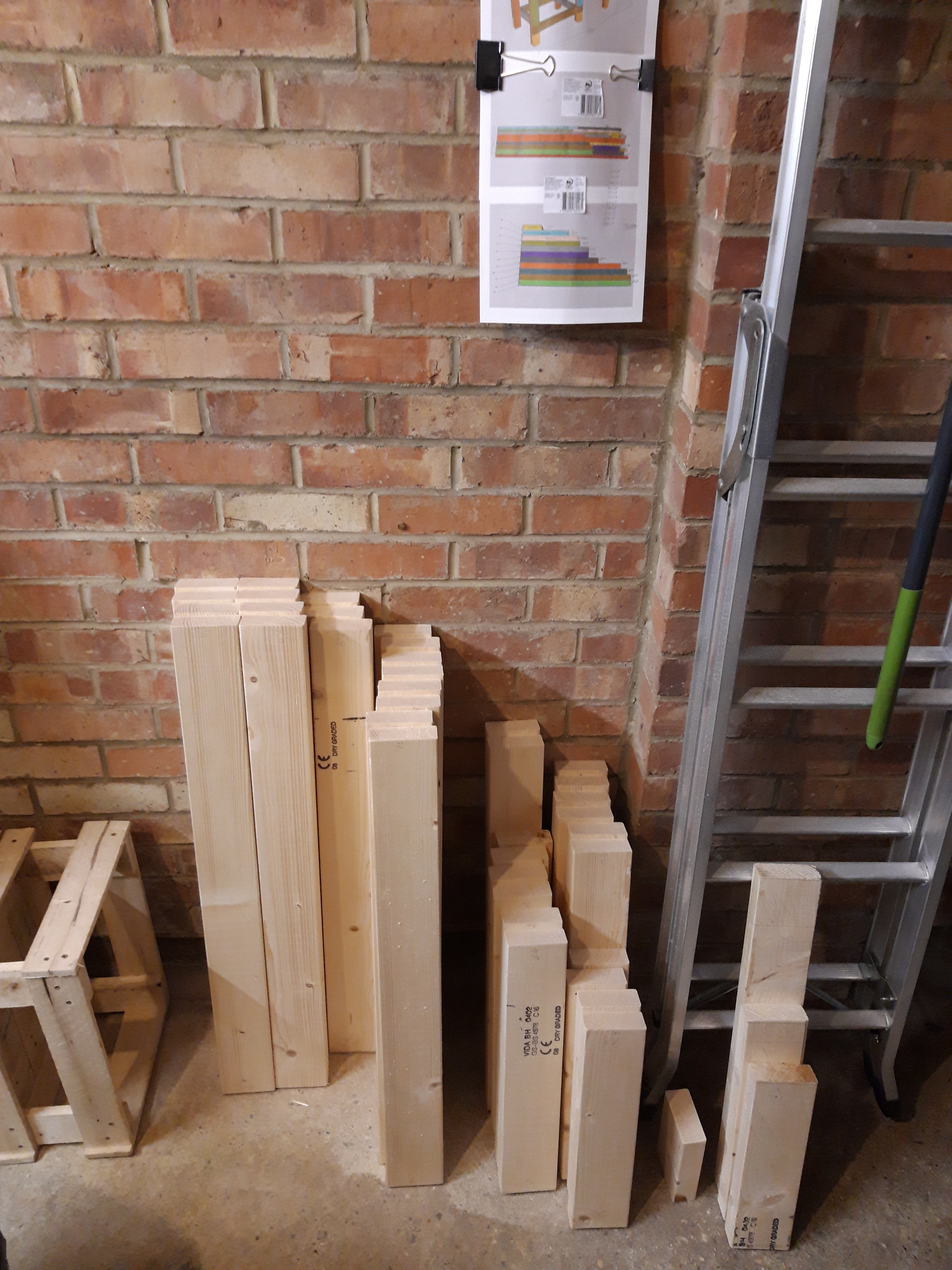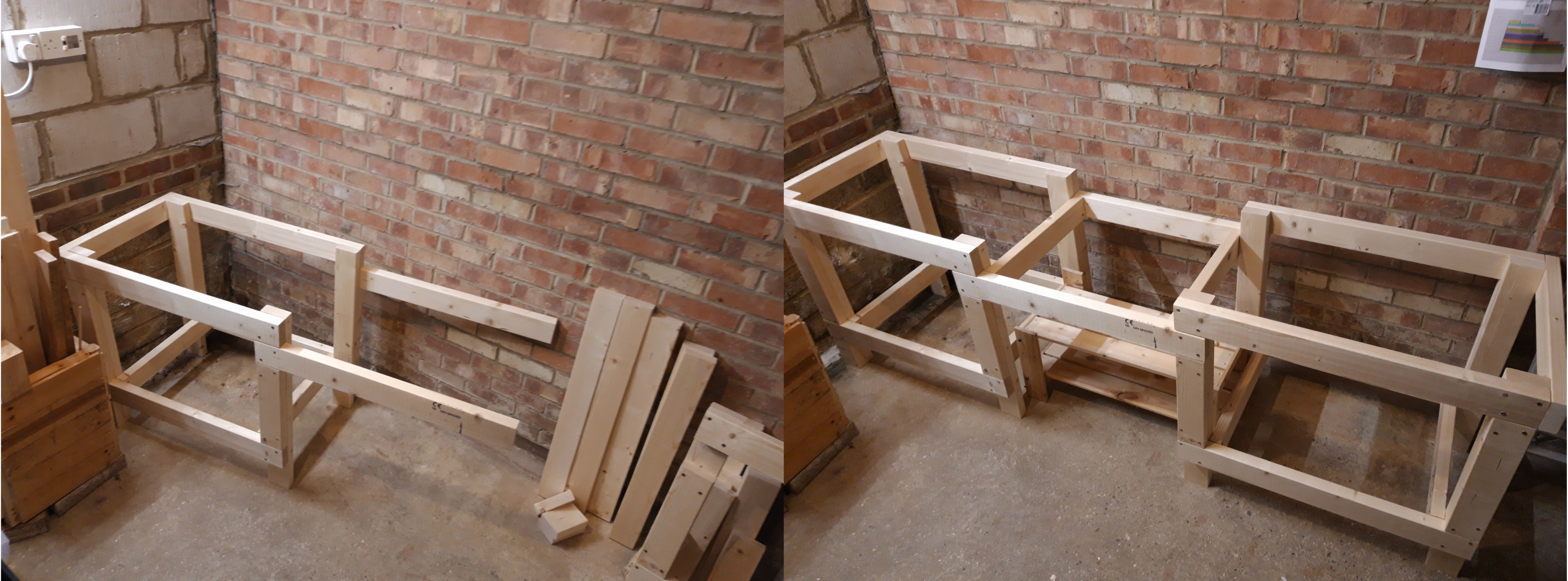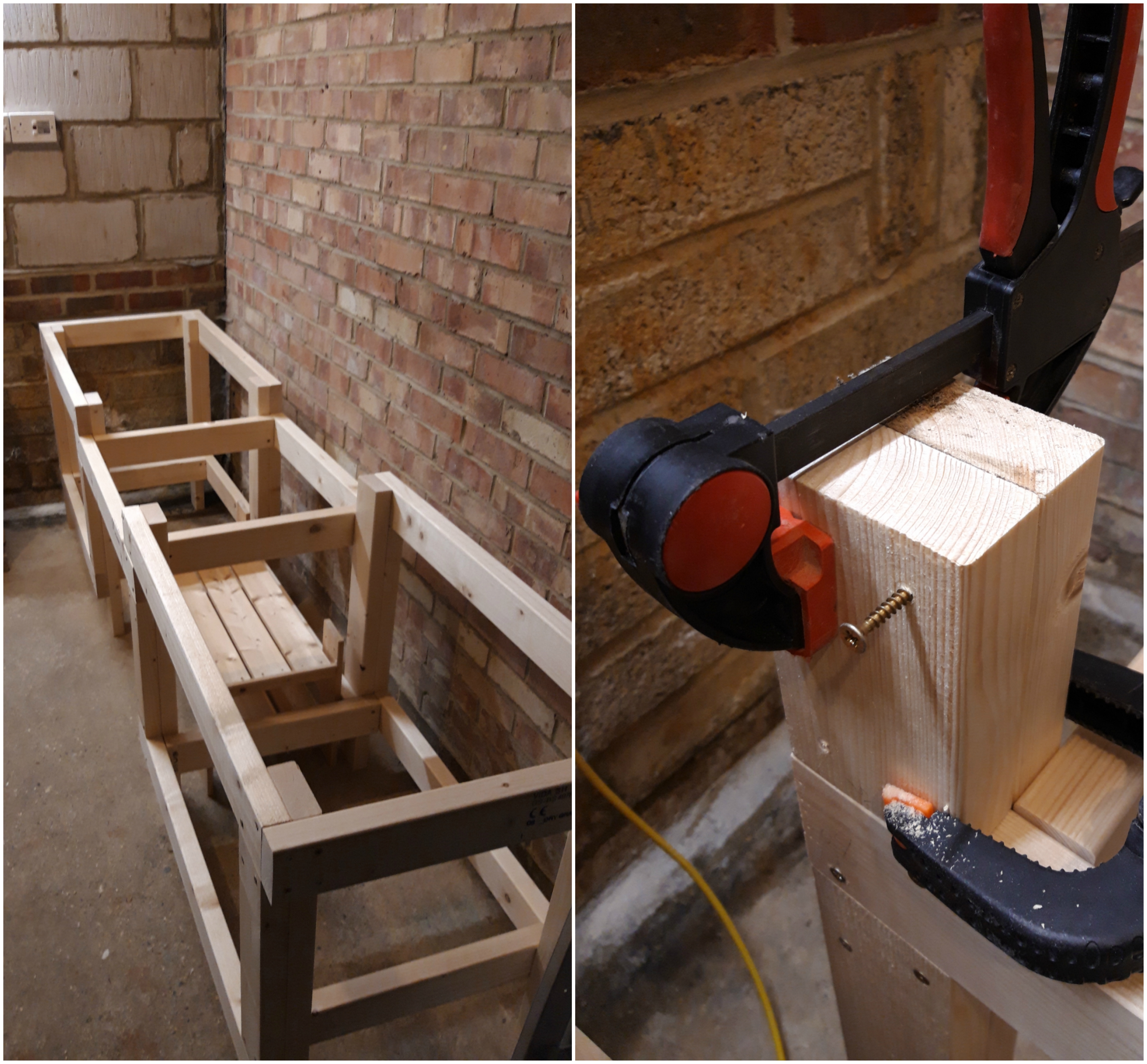 Once I had one side completed, I repeated the full process as an exact mirror image to make the other side. I had to do quite a lot of sorting and tidying of the garage as I went, to make enough room to lay out the pieces. I designed the bench to fit pretty snugly into the slight recess in the back right corner of the garage and had to keep moving everything round as the bench grew to give me enough space to work!