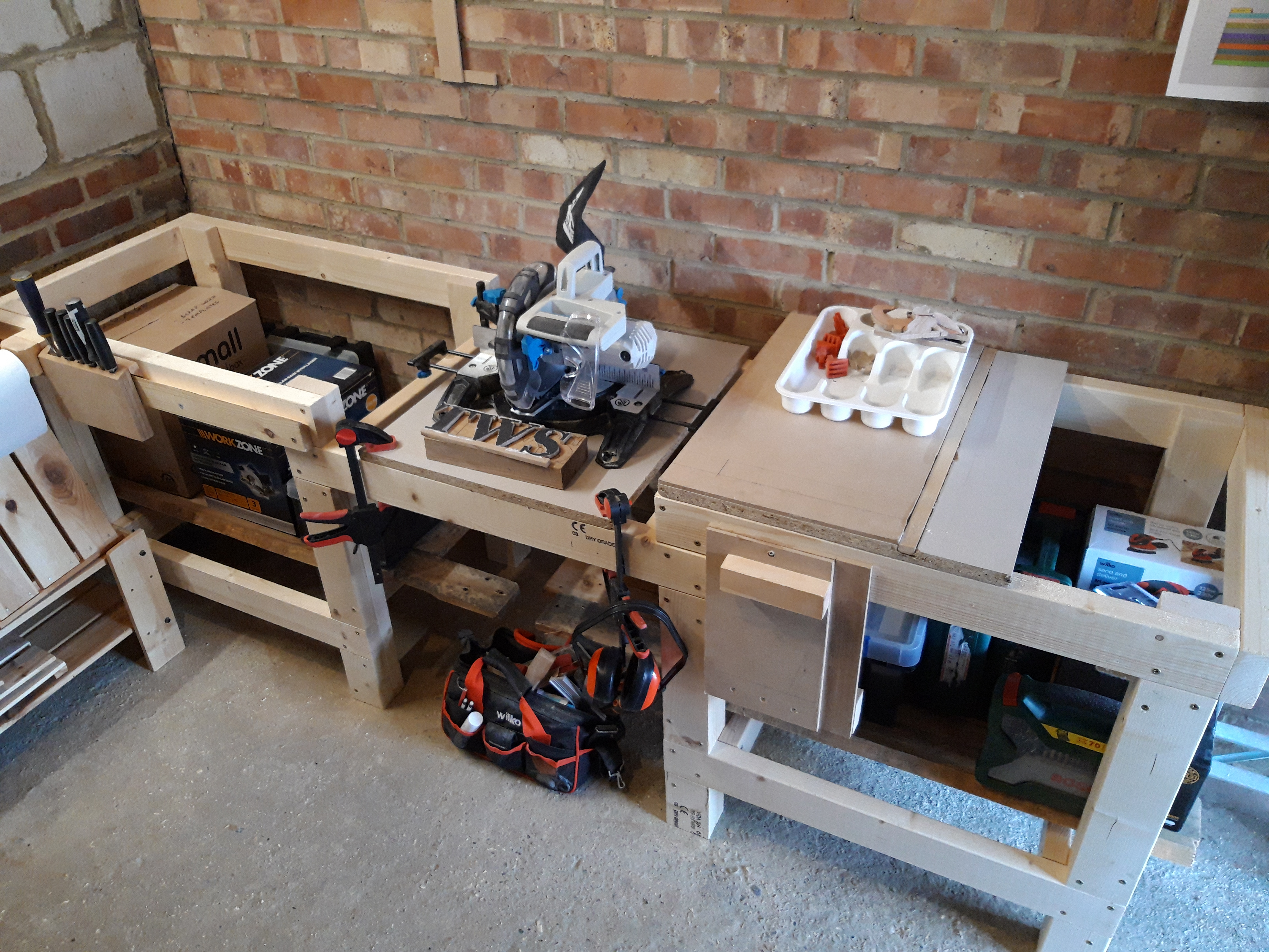 This concluded a very exhausting weekend spent measuring, cutting and assembling the many pieces into the nice sturdy mitre saw bench frame! I still need to get some thick mdf (at least 18mm) for the bench tops but that will require another trip in the car and some measuring to confirm the exact dimensions needed for each section. I used some planks from multiple disassembled pallets to temporarily create shelves underneath, enabling me to clear the floor and make it easier to move around the garage again!