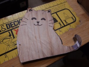 Once I had the rough shape cut out, I went around the shape with various shaped files and sandpaper to dial in to the pencil lines. I was particularly pleased with the curled up tail and spent quite a while sanding to make everything nice and smooth so the cat is comfortable to pick up and move about. I like that the ears are differently shaped as it makes the cat seem more lifelike – ours regularly sit with very special looks on their faces, or with a tiny bit of tongue poking out!