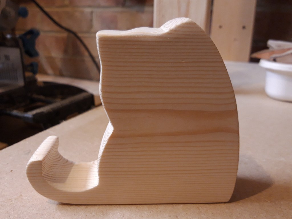 To finish the workpiece I decided against using a stain, predominantly because I didn’t have any left at the time, but also because I didn’t want the smell of any oil or varnish to be released if the holder gets damp in the humidity from cooking in the kitchen. So I left the finished holder as bare wood and gave it to my wife as a fun weekend present. She really likes it and the cat (phone holder) now lives on top of the microwave. Our (actual) cats tend to sit happily on top of the fridge and stare down at us while we’re in the kitchen, waiting on any spare chicken to appear!