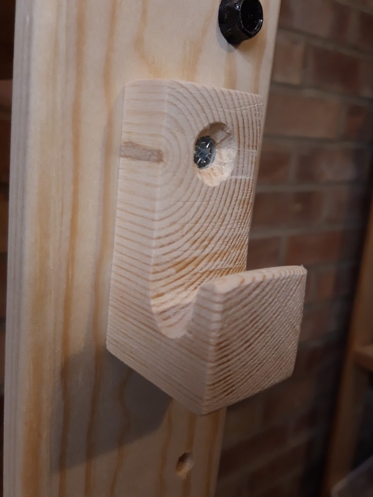 After a lot of sanding I was happy with the finished shape and rounded over the front edges slightly to make it more comfortable on the hands when hanging things on the hook. I then drilled a small hole through the hook, using a scrap piece of wood underneath to prevent tear out, and used a countersink bit to create a recess for the screw. Then it was the simple task of mounting the hook where I wanted it on the front of my mitre bench shelving. I used a single screw to hold the hook in place, as it isn’t going to be holding much weight and I can then move it easily in future. And now my ear defenders and safety glasses have a permanent home where I can easily grab them to keep myself safe on all my future projects! 🔨