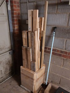 I decided the best way was to split my wood into three types – sheet material, like plywood, mdf etc; longer pieces of lumber, like pallet beams, cut offs of 2x2s, 2x4s etc; and then planks, like pallet slats in assorted dimensions. I’ve also got a bucket of blocks salvaged from the dismantled pallets, although I don’t currently have a use for the sawdust blocks!