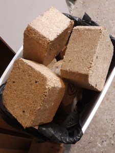 The sheet material was relatively easy to organise, as I have the offcut from a shelving unit I cut to size when we moved in two years ago at the end of the workshop. I need to do a proper sort of the sheet material at some point, but for now it is all “neatly” arranged on the shelf, which keeps it off the floor and stops it getting damp. And I currently have a bucket containing the salvaged blocks from the pallets next to it!