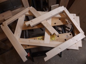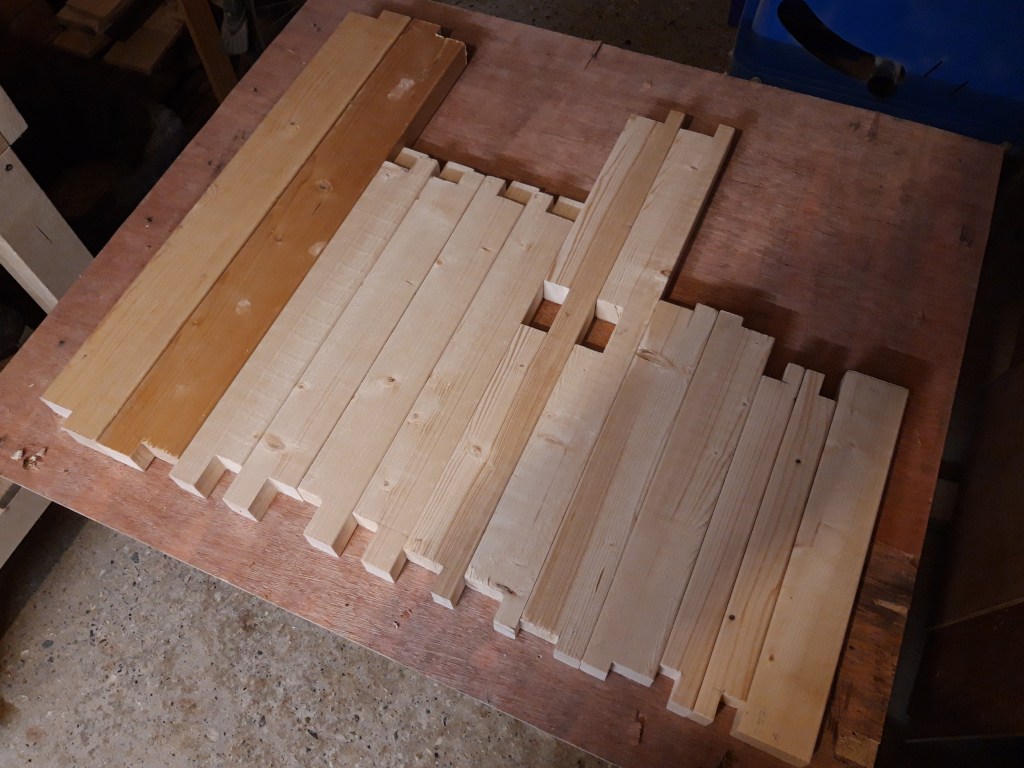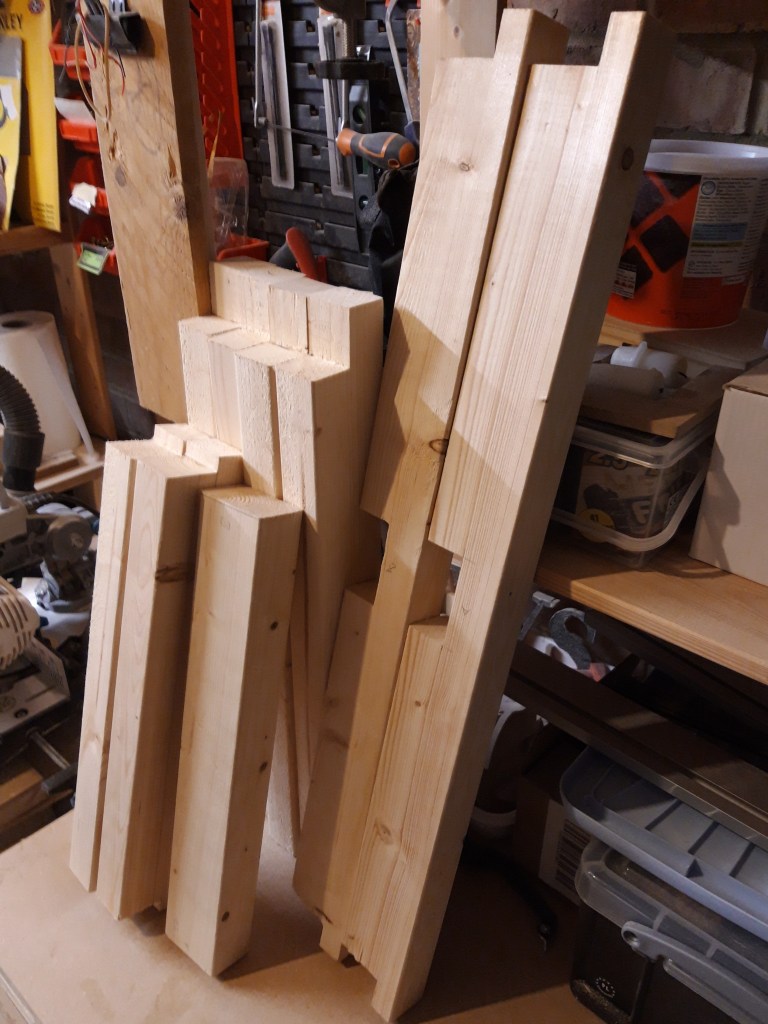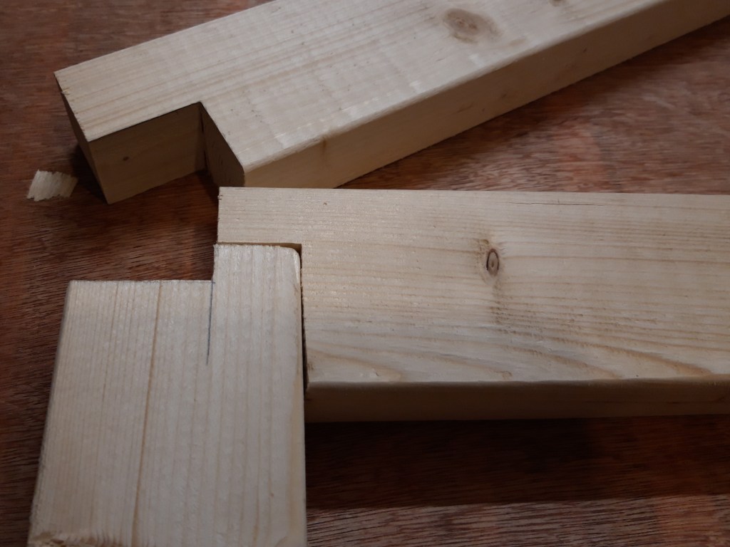 After a lot of cuts with my mitre saw to get every piece to length and then a lot of repeated measuring and chiselling, I had all the components completed. The final long stretchers are also made of 2×4 but I used an older one which had changed colour quite a bit! Once I sanded all the pieces however (which took an age!), all the components were a very similar shade of pine again. I carried out a test dry fit of all the pieces together, which I had been basically doing in stages throughout cutting and chiselling all the components, and was very happy with the result. The centre support in the base of the frame was a little tight but was fine with some glue applied and a few gentle taps with a mallet to get it into place!