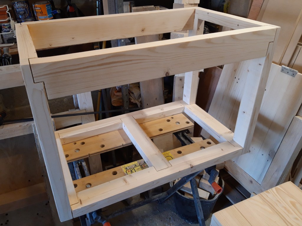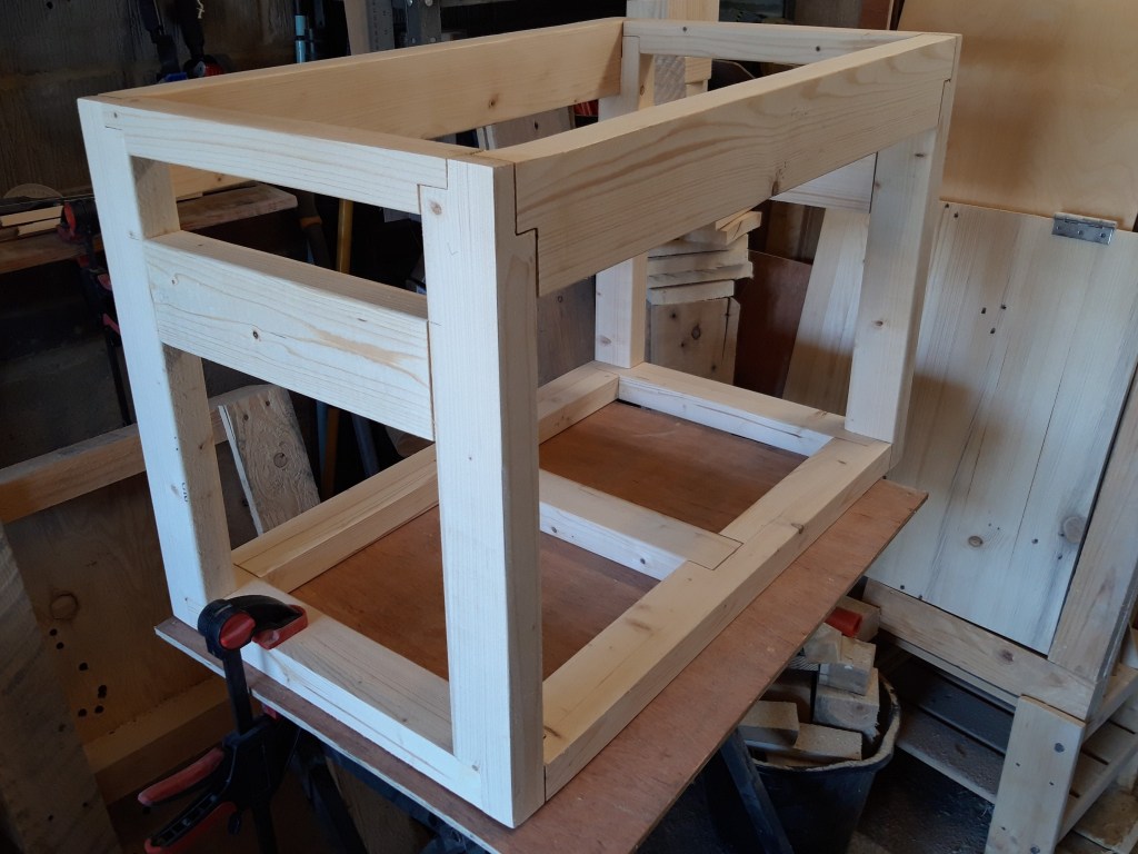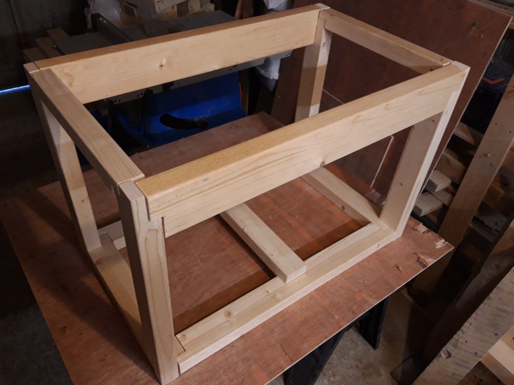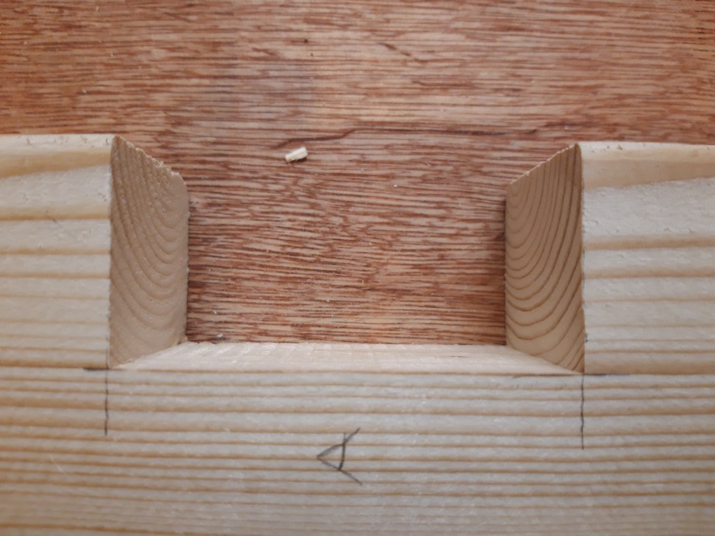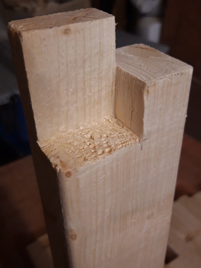 I started by figuring out how to make 3-way joints for connecting the corner posts into the bottom stretchers and chiselled out a mortise for the centre support to slot into to provide a large surface area for glue. Each stretcher connected via a mortised section at the end of the 2×4 piece, which provided a bit more area for glue that a butt joint would alone. The corner posts run straight down to the base of the trunk which means the weight from anything supported by the posts doesn’t have to pass through a joint which might get weakened over time through wood movement and slight deforming of the structure as the trunk gets lifted and moved around.