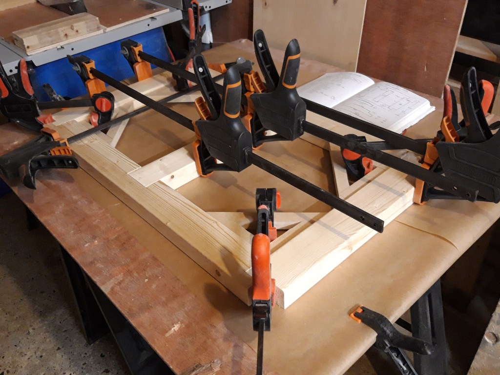 I started the glue up with the base and used a selection of clamps to hold all the joints together. I made some 90 degree (right angle) triangles out of mdf and then used my jigsaw to cut out a smaller triangle in the centre section. This gave me the ability to clamp the corners together at exactly 90 degrees with one clamp and ensured there was no racking within the frame as the glue dried. I do have a specific corner clamp, which I have used several times for simple assemblies. But as I wanted to do all 4 joints within the base simultaneously to ensure the angles were spot on, I made my own triangular variation!