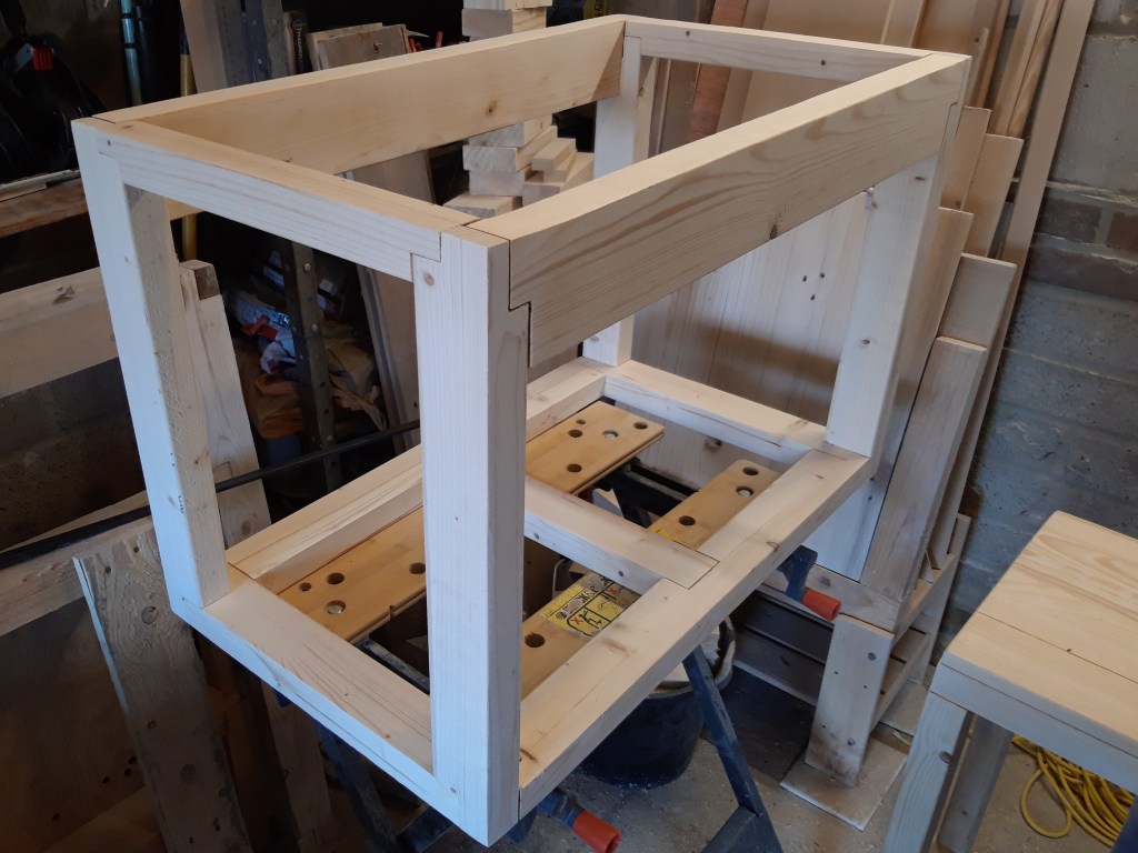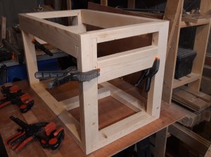 Once the base and uprights were fully dry, I glued them together as well and then slotted the long top front and back stretchers into place. I used long clamps combined with a band clamp to tighten everything together while the glue dried and then a couple of days later, spent another age giving everything a sand to remove any excess glue squeeze out that I’d missed and to ensure the joints were all flush.
