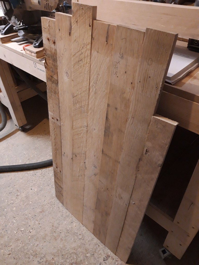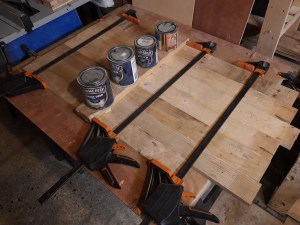 After confirming all the pieces of the frame fitted snugly together, I applied glue and lots of clamps. While the frame was set aside to dry, I selected a number of the same (or very close) thickness boards and ripped them down to remove the edges and provide a smooth and flat surface for gluing. I worked out an order that made interesting grain patterns and then used a piece of plywood on top of my workmate to provide a large flat surface area for glue up. After applying lots of glue and clamping in place, I placed a board covered in tape on top weighed down with tins of stain and paint to ensure the boards remained flat while the glue dried.