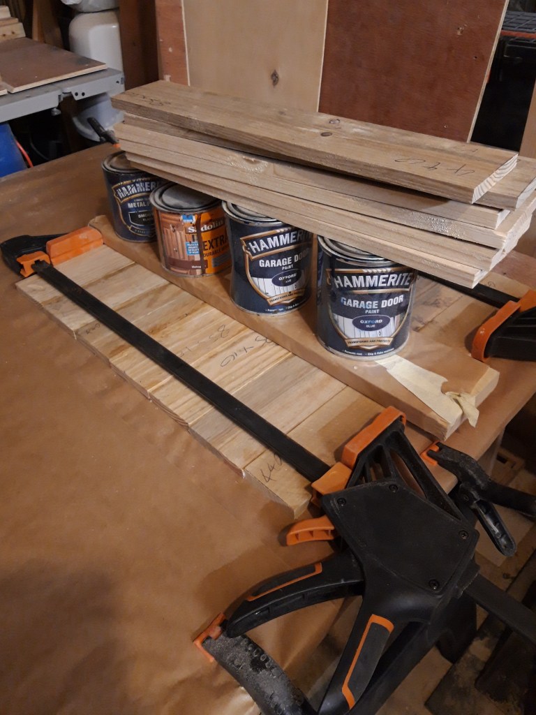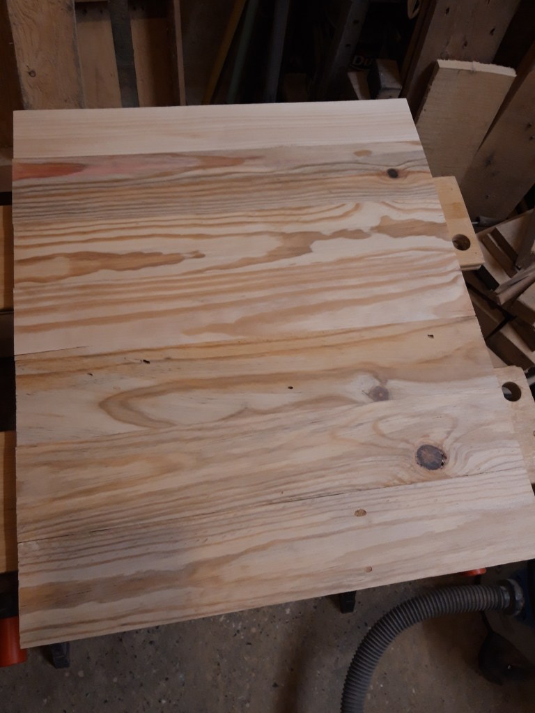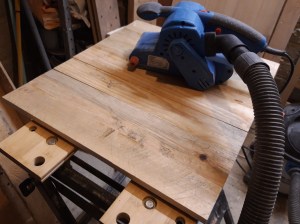 The first step was to cut a number of planks to the approximate length for the short side panels and then glue them together using lots of clamps and a board covered with packing tape and greaseproof paper to keep everything flat. Once the glue was dry I thoroughly sanded both sides of the panel with my belt sander to smooth the joints and flatten the panel. I then used my random orbit sander to further smooth the panel, increasing the grits to provide a smooth finish.