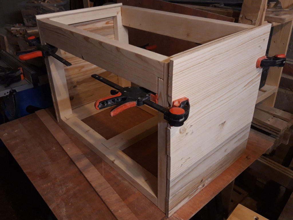 I then spent more time sanding all four side panels and the top frame to remove any glue squeeze out. I then positioned the frame for the lid on top of the trunk and glued on additional offcuts from the side panels to frame out the lid. I used the same planks for the lid as for the side so as to try and have matching grain when the lid is closed.
