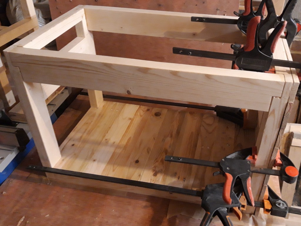 Once the base was completed, I started fitting the short side panels first, as the long side panels overlapped the edges and therefore needed the short side panels to be flush with the frame. While the glue dried I used my palm router to flush trim the edges of the base panel to the frame to allow the long side panel to also be able to fit flush to the frame.