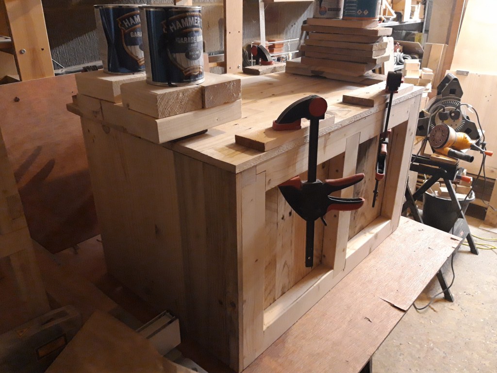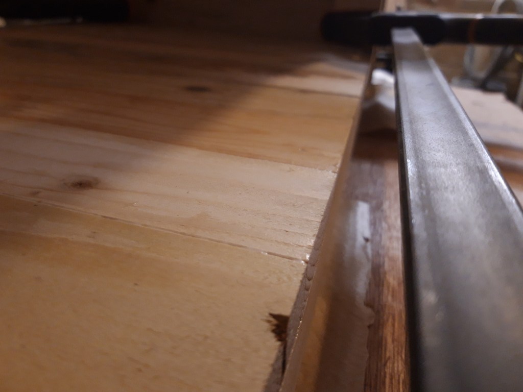 I cut more planks for the long side panels and glued those up in the same way, using a board to keep the panel flat as the glue dried. Repeating the sanding process on both sides of each panel using my belt sander and random orbit sander resulted in two more panels ready to be fitted to the trunk. This took quite a while as it was an awful lot of surface area to sand!