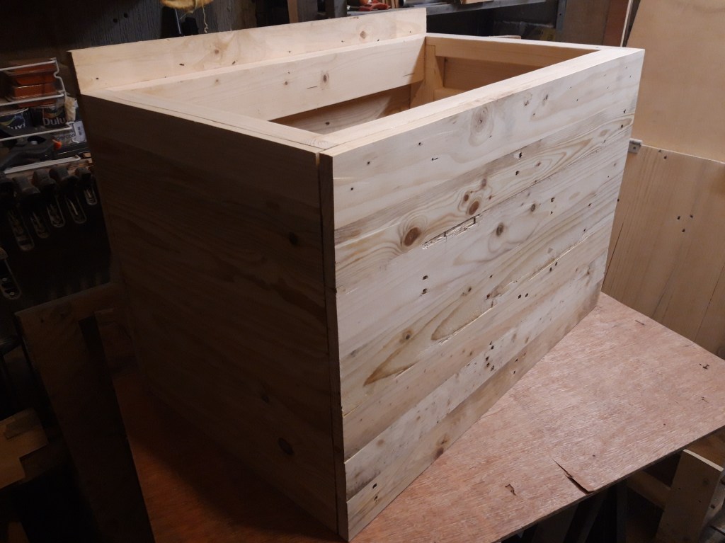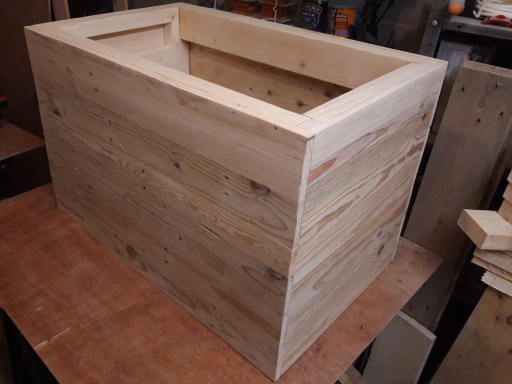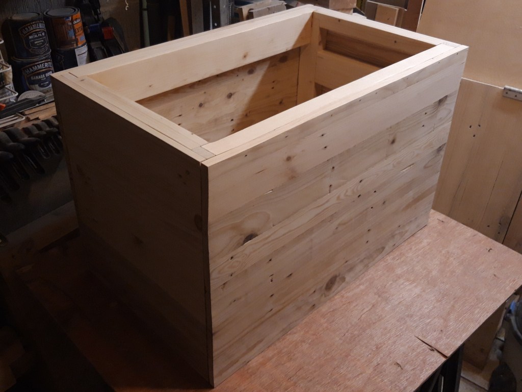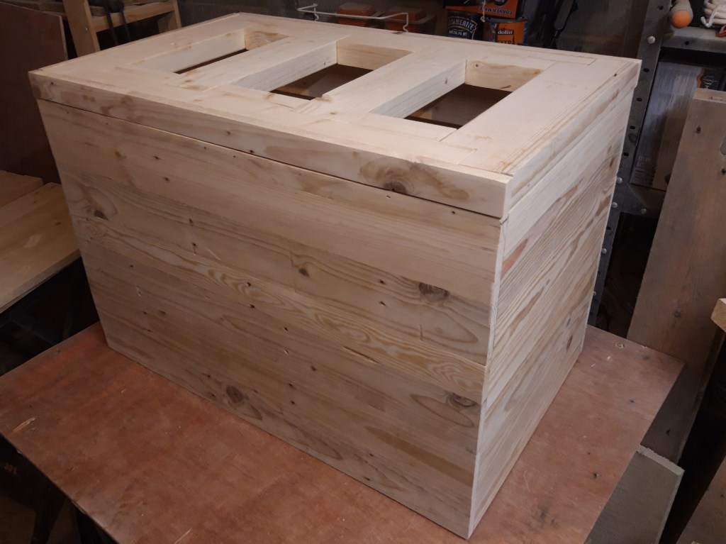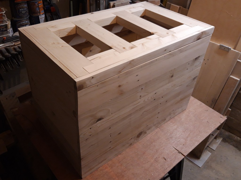 Last year my Dad turned 60 and I wanted to give him something really special – a large personalised wooden trunk! After constructing a very solid frame out of pine constructional lumber and making the frame and panel for the lid, I moved on to making the side panels.