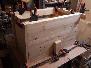 I then repeated the process for the long side corner braces and glued them into place, using clamps to hold them while the glue dried. I made sure the top of the braces was flush with the top of the frame and the side panels of the trunk using my hand plane and then sanded the top thoroughly to ensure a smooth and flat edge.