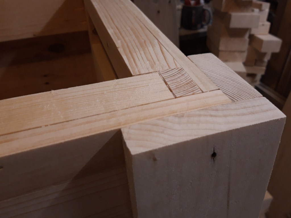To finish the corner braces off, I added the trimmed off pieces as corner braces to the lid, so as to have continuous grain. The next step – adding hardware! 🔨