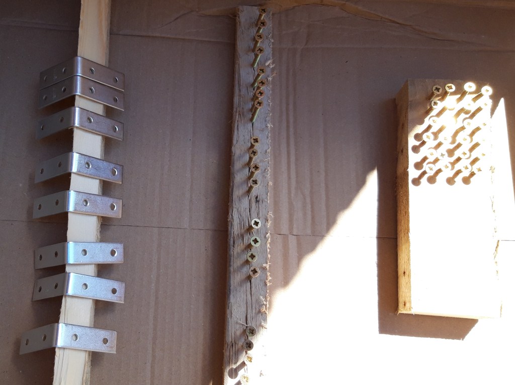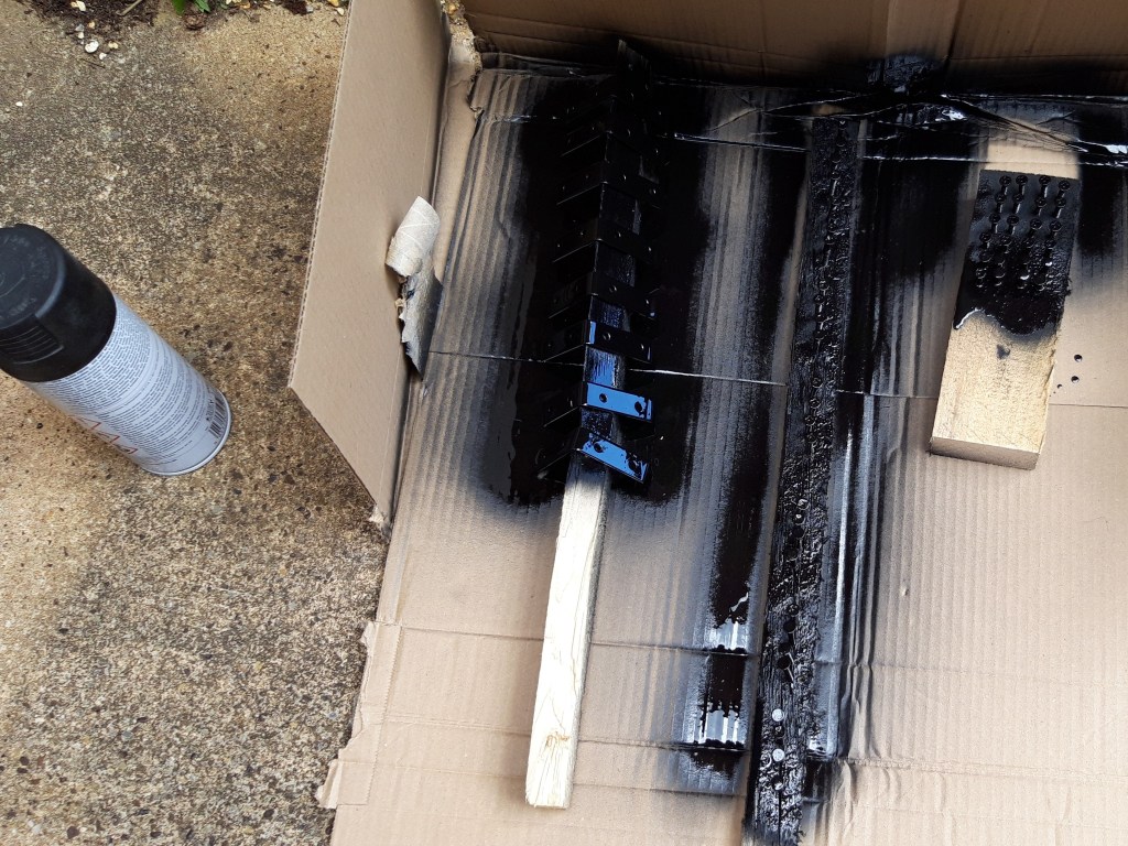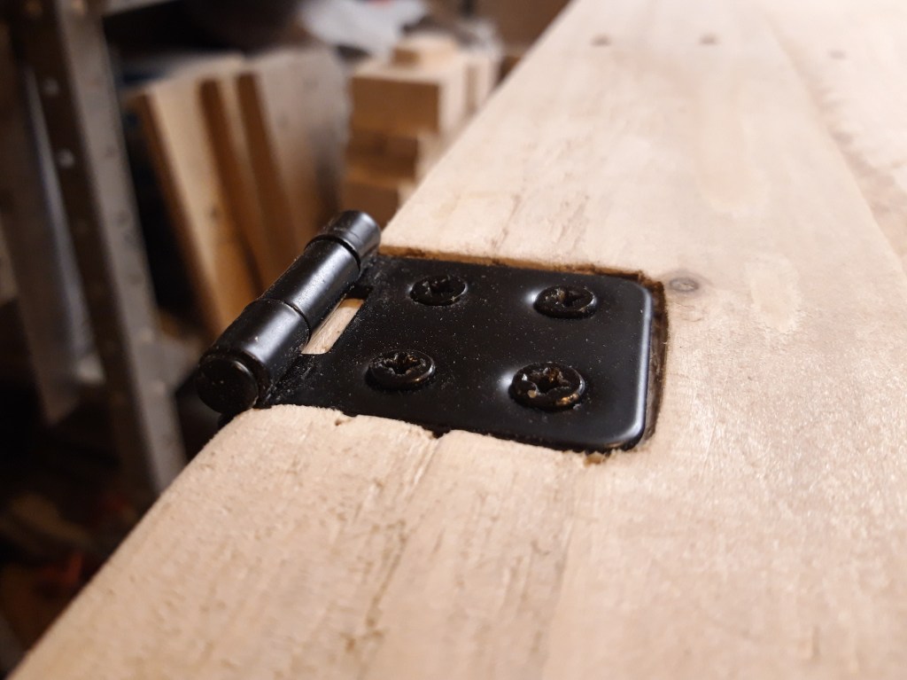 The corner brackets and screws I had were all shiny metal coloured, so I spent some time screwing a whole load into some scrap wood and then I spray painted them all with a couple of coats of black spray paint. I left them for a day to dry and chiselled out the section for the latch and the hinges so they were flush with the wood of the trunk.