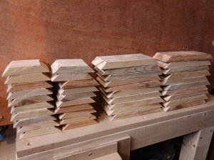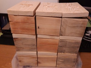 While the glue dried I made the lids for the boxes using some more prepared lumber. I used letter templates held in place by tape and using a straight bit with a bearing in my palm router, I removed a few millimetres of wood from the centre of each lid. I then hand sanded the initial and rounded over the edges slightly to soften the look of the box.