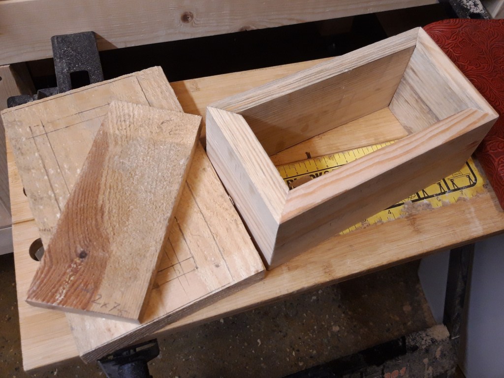I spent a long time preparing all the lumber by ripping it to the right widths and sanding it flat and smooth. I decided to use pallet slats as I had a lot left over in the workshop from previous projects and it meant each box was also a way of reusing the wood in a new way. I wanted to make each box out of one plank of wood so as to have the grain running around the whole box, so as I was making quite a few so I could give one to each member of my family, I made sure to keep track of which box each piece belonged with using small pieces of tape which I wrote on (rather than writing on the wood directly). Some of the pallet wood had particularly interesting grain patterns so I made sure to include those features within the pieces I marked to cut.