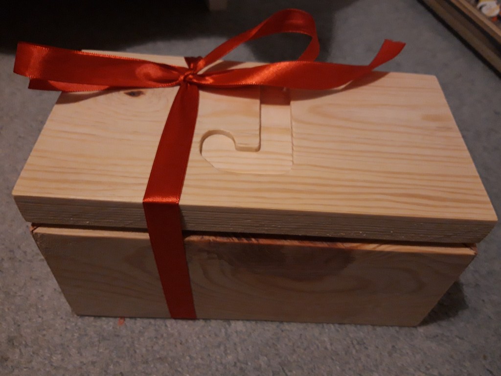 I installed a set of hinges on each box, using a chisel to carve out a small section in the box and lid for the hinge so the lid would sit flush when closed. Then I finished each box with Danish oil to bring out the interesting grain patterns and left them to dry for a few days. I completed the project by filling all the boxes with Christmas presents and adding a ribbon! 🔨
