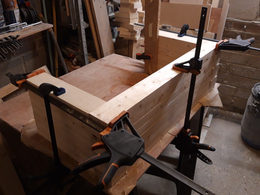 After cutting all the lumber to the right sizes and removing the round over from the 2x4s, I glued up all the pieces using clamps to hold everything in place while the glue dried.