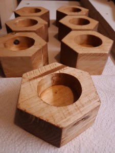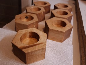 I cut a pine 2×4 into pieces slightly larger than the final dimensions I wanted and then used an angled stop block on my mitre saw sled on my table saw to take cuts at a 60 degree angle to turn each block into a hexagon, turning the workpiece after each cut. I marked the centre of each newly-formed hexagon and then used a Forstner bit to drill the hole for the tealight in the centre of each tealight. This would have been much quicker with a drill press/pillar drill so I definitely need to add one to my list of tools to get at some point!