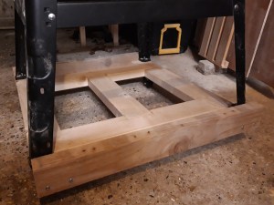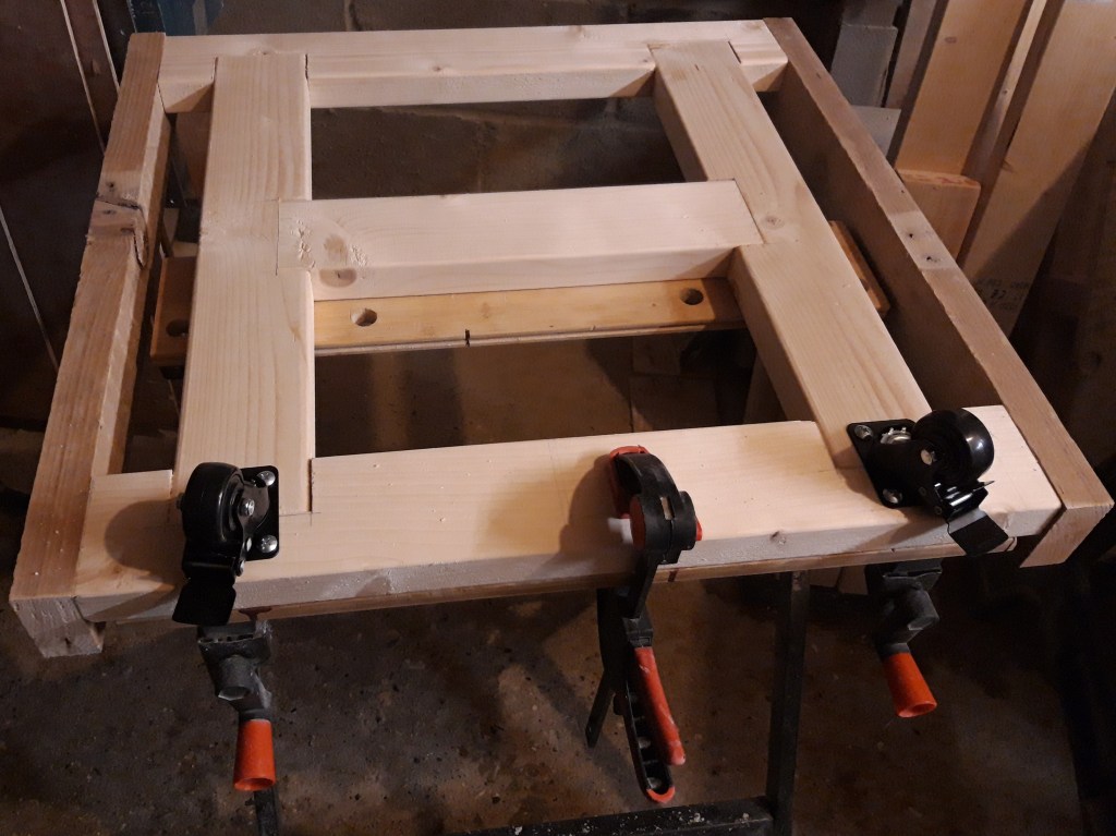 After finishing the frame I worked out where I would need the casters – I wanted them to sit slightly inside the frame so I would be less likely to trip over them and the frame could remain the size of the floorprint of the legs, rather than making it much bigger with the casters outside the legs.