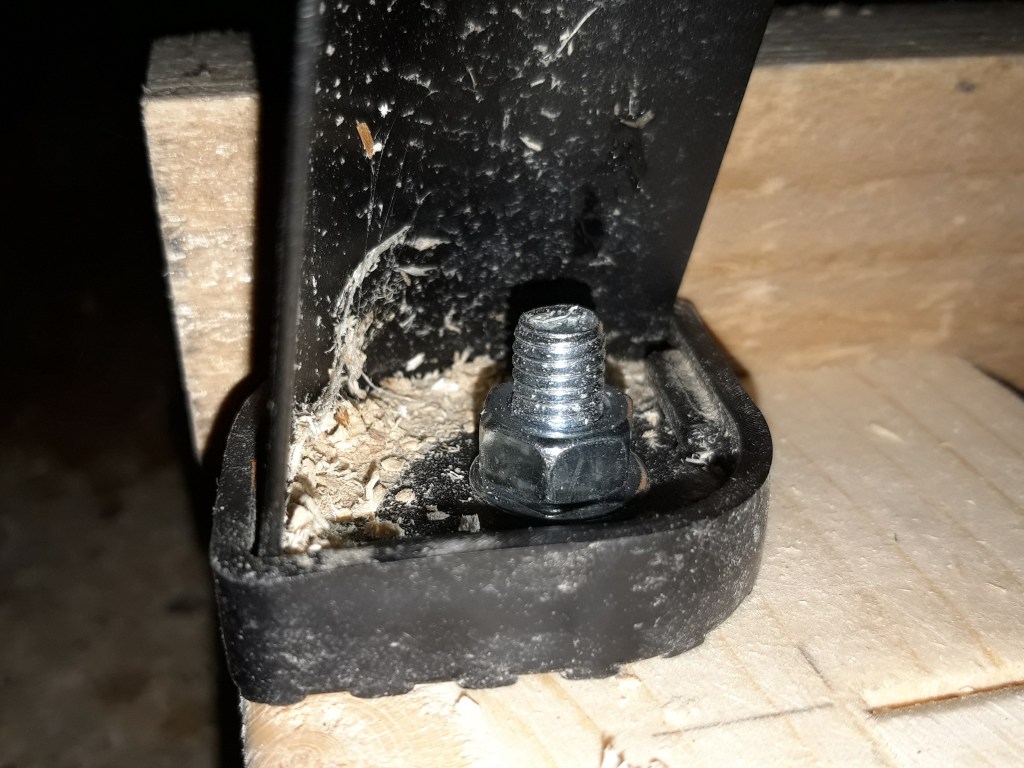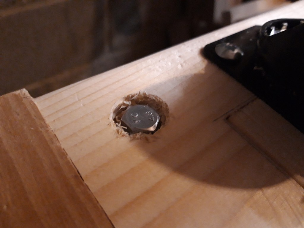 I got four swivelling casters which all lock in a fixed position and after mounting them to the frame, I lifted the table saw into place and discovered the bolts I planned on using to secure the table saw to the frame interfered with the swivelling of the casters. So I made a 1cm recess and sunk the bolts into that, making the top of the bolt flush with the surface of the frame.