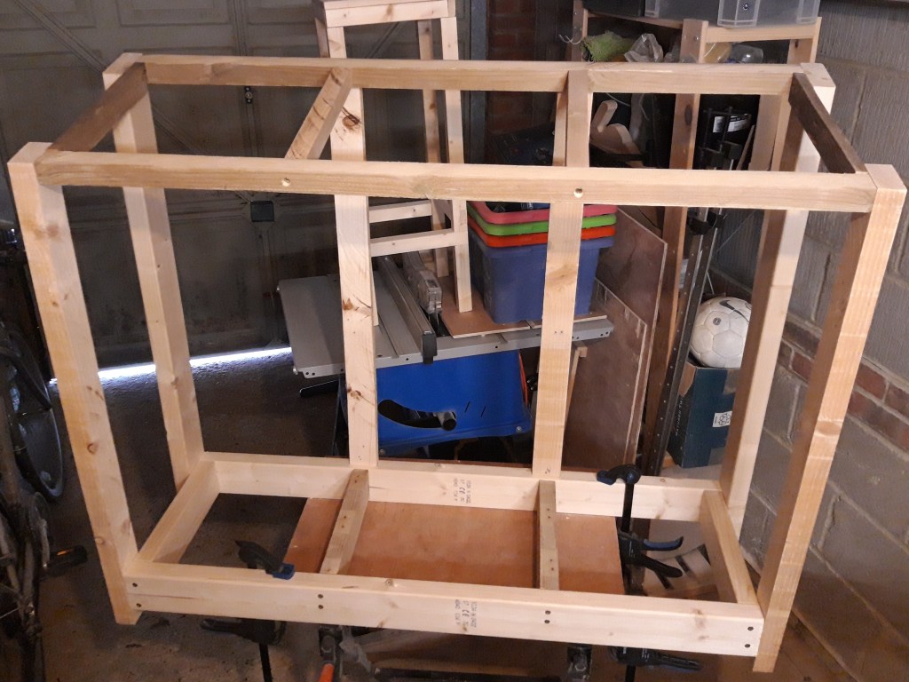 I cut the long top stretchers to length and then drilled and screwed them into place. This made the frame a bit more stable although showed me that I needed to add additional bracing in the centre of the base and top to provide more support.