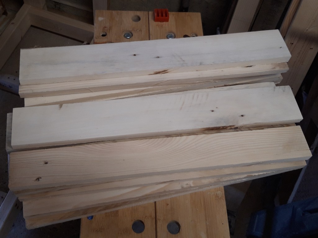 I ran the selected slats through my table saw to get two straight edges and then cut them to the right length on my mitre saw. I sanded them all using my belt sander and random orbit sander again.