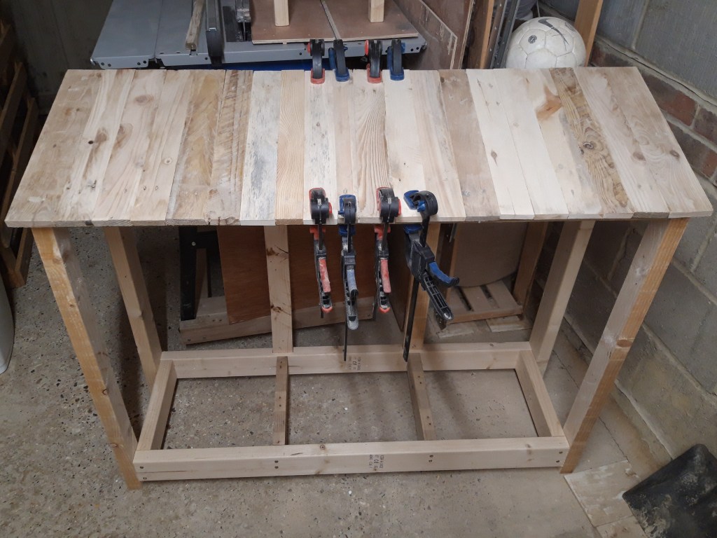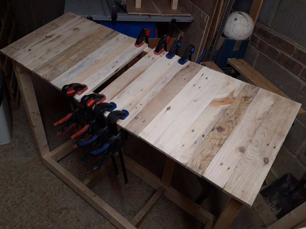 I applied a decent quantity of wood glue, positioned the first slat to provide a slight overhang on each end and then clamped them in place.