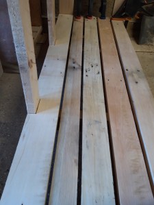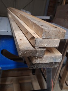 The next step was to sort through my lumber and select suitable pallet slats for the roof. I laid out all the suitable pieces to a rough fit and then ripped them to get two straight edges using my table saw and cut them all to length on my mitre saw. I sanded each side with my belt sander to remove the rough sections where the nails had been and then sanded up to 120 grit using my random orbit sander.