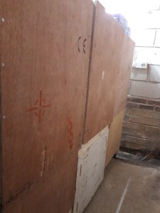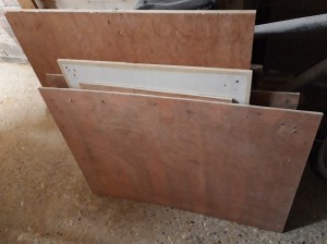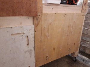 But with some lateral thinking (and my knee!) I managed to get it secured with a number of screws and the back panels were all firmly fixed in place in an interesting patchwork of colours of scrap pieces of plywood.