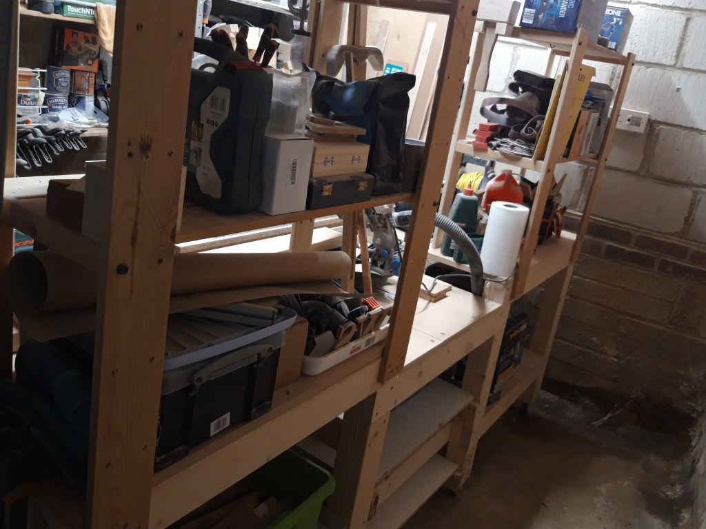 As I have acquired more tools and accessories, the shelving on my mitre saw bench has filled up quite nicely! The problem is however, that I keep losing things off the back of the shelves and off the bench itself – time to add some back panels!