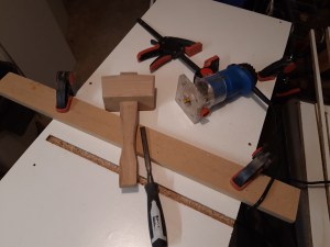 After all the pieces were cut to size, I used my palm router and a straight edge to route a number of grooves into several of the pieces. I took around half the material out in the first pass and then lowered the bit and completed a second pass. That way it wasn’t too much work for the router and minimised any chip out from the workpiece. I used my chisel to square up the end of the grooves – I wanted to have the pieces fit together using “stopped dados” so as to hide the front edge of the joint. I tested each dado with the corresponding divider and then did a dry test fit of the main support pieces using a selection of clamps to check it all fitted together correctly.