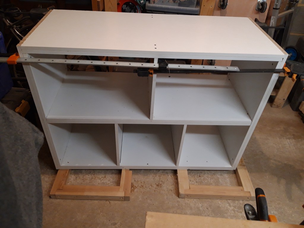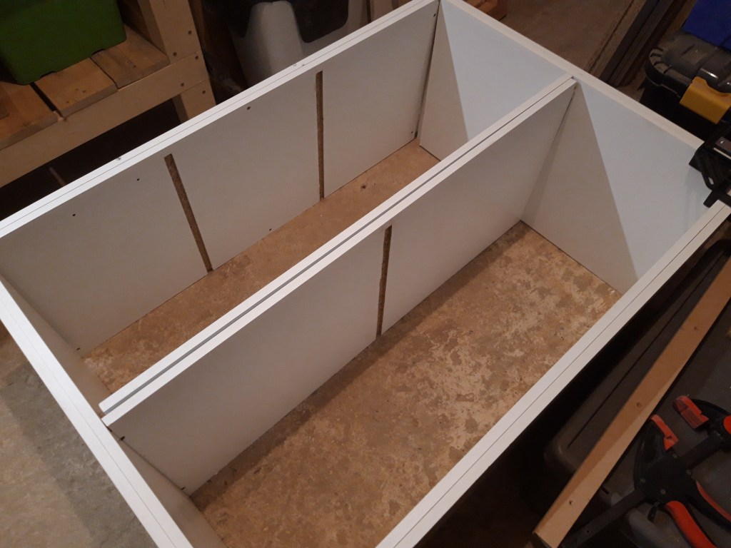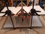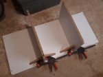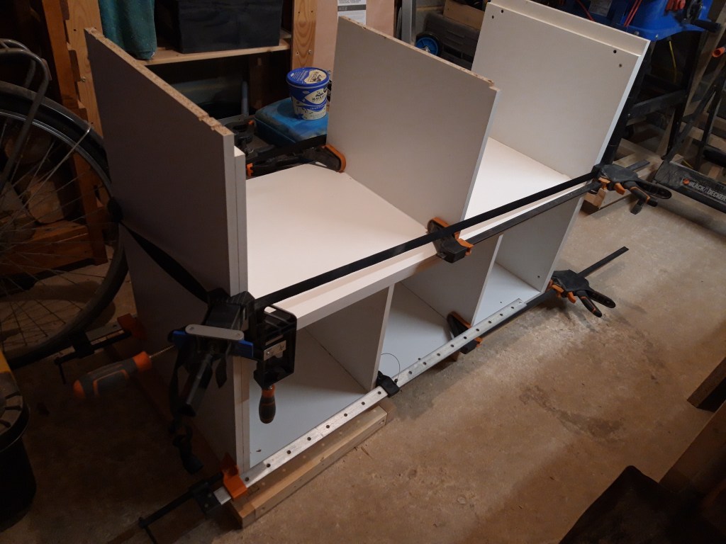 Once I had completed the final prep work, I started the glue up. I used some 90 degree hollow triangles I cut out of 18mm mdf to assist with supporting the dividers while the glue dried. These allowed me to secure clamps to ensure the dividers were kept plumb and square to the shelves.
