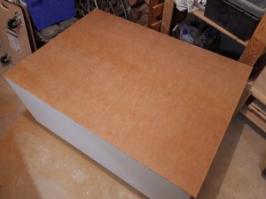 I secured the plywood in place using tacks which I hammered through into the chipboard. I marked lines for the dividers and centre shelves to allow me to add additional tacks across the whole of the back of the shelving unit, rather than just around the edges.