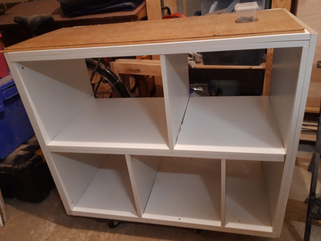 I then re-secured the side panel and re-measured the back plywood, cutting off the excess with a hand saw and again using a flush-trim bit in the palm router to ensure the back panel fitted snugly to the shelving unit.