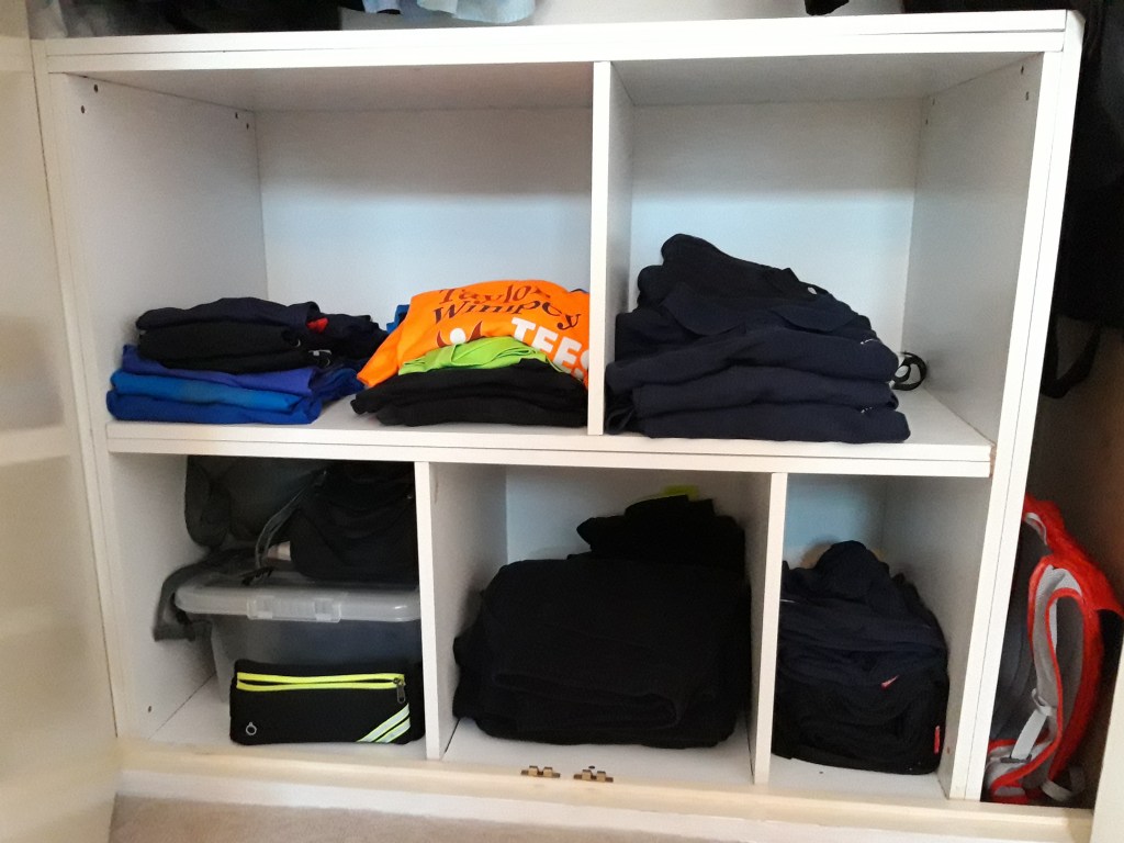After manoeuvring the shelving unit back upstairs again (slightly lighter but still very solid!), I then re-secured the back panels. We found it easier this time to carry the shelving unit in without the back on, as it meant we could put a hand on each side to lift it more effectively. Once the panels were tacked back into place, we lifted the shelving unit into the bottom of my wardrobe and I started trying to work out what clothes could go where. I now have more storage space than I need, so will see what works best for what clothes I need at the moment eg. work clothes, what I need to be accessing regularly eg. running gear and what can be put in a less easily accessible place eg. beach gear and swim shorts. I expect I shall keep moving things around until I find the optimal layout for the various seasons throughout the year, but this will make it a lot easier to get to my various different clothes, plus space to store my running gear and water backpack (Camelbak – not sponsored!) out the way when I’m not using it. So in all, despite the slight hiccup, another successful project! 🔨