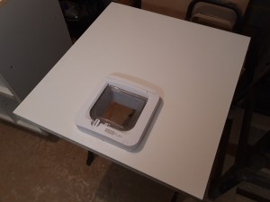 Once we had selected our cat flap and the panel arrived, I worked out the right height for the panel to be slotted into the door and followed the mounting instructions. I drilled out several holes in the panel and then joined them up with my jigsaw to make the required opening. The hole was a little snug so I used files and sandpaper to adjust the dimensions slightly to allow the “tunnel” section of the cat flap to fit through the panel easily while still being a good solid fit.