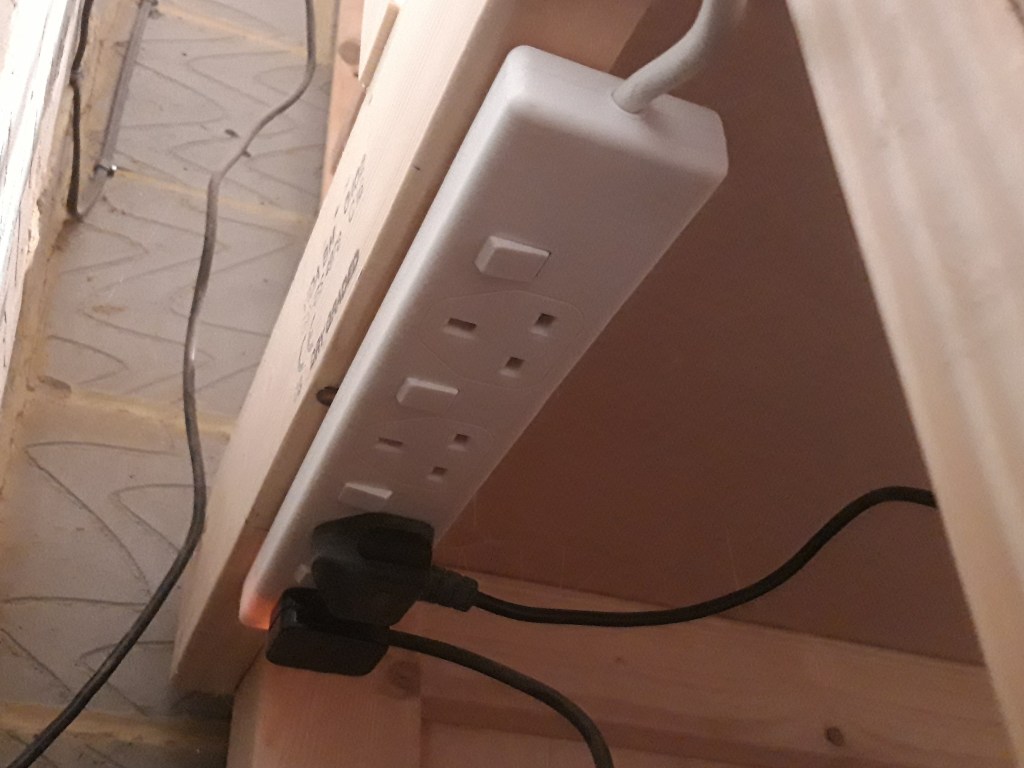 I had a fluorescent tube light on the wall in the workshop at the old house, which I managed to safely transport to the new house. I mounted it to the end wall of the workshop in existing holes and fitted a multi-socket extension lead to the underside of the mitre saw bench. I plugged the light into the first socket via a reclaimed switch from an old metal router table.